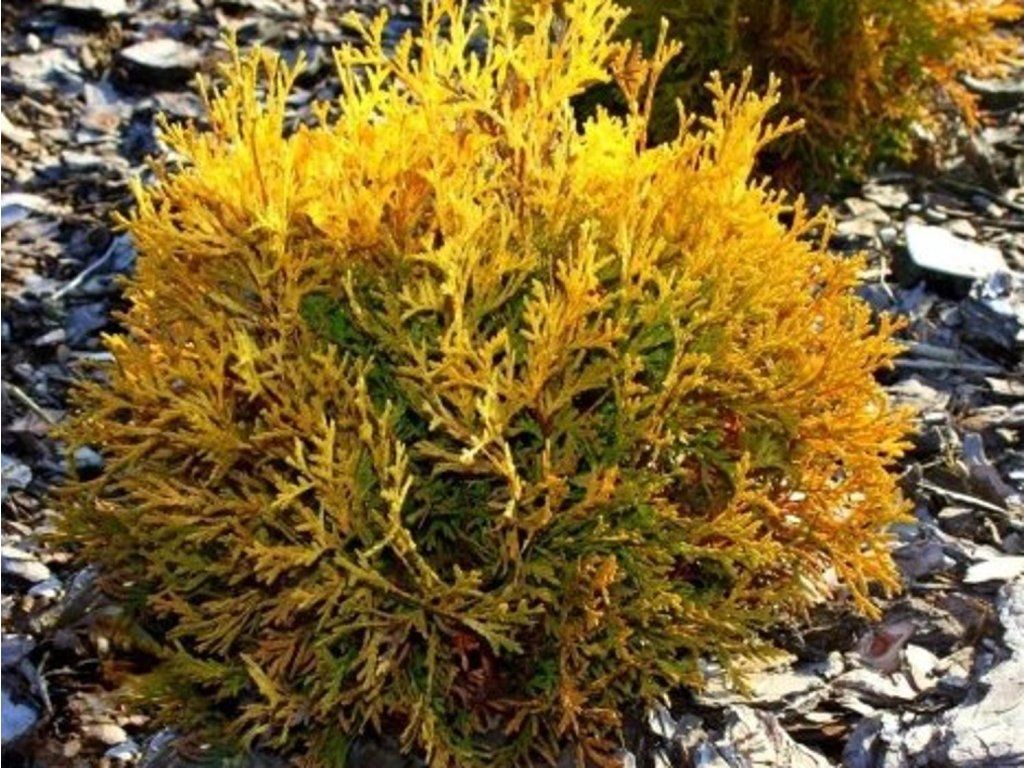 Abendländischer Lebensbaum 'Chinese Baby' - ein Lebensbaum mit dichtem und kugelförmigem, langsamem Wuchs. Das Erkennungsmerkmal dieser Sorte ist die goldgelbe Färbung der Nadeln, die sich im Herbst und Winter in Bernsteintöne verfärbt. Im Alter von 10 Jahren erreicht er einen Durchmesser von ca. 1 m. Dank seiner Färbung eignet er sich als Solitär, kommt aber auch in Gruppenpflanzungen gut zur Geltung. Zeichnet sich durch hohe Frostbeständigkeit aus. Dank des langsamen Wachstums ist kein Schnitt erforderlich.