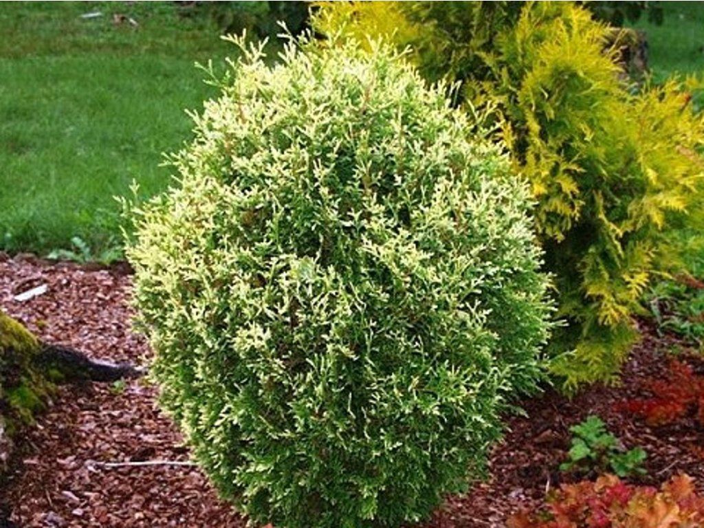 Abendländischer Lebensbaum 'Gold Perle' - eine Sorte mit kegelförmigem Wuchs. Im ausgewachsenen Zustand erreicht er eine Höhe von etwa 1,2 m. Sie vertragen Rückschnitt gut. Die Nadeln sind weich, dunkelgrün gefärbt und die Spitzen sind cremefarben gelb. Die gesamte Pflanze strahlt. Die Sorte eignet sich als Solitärpflanze und kommt auch in Gruppenpflanzungen sehr gut zur Geltung.