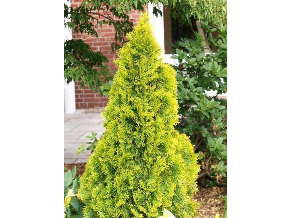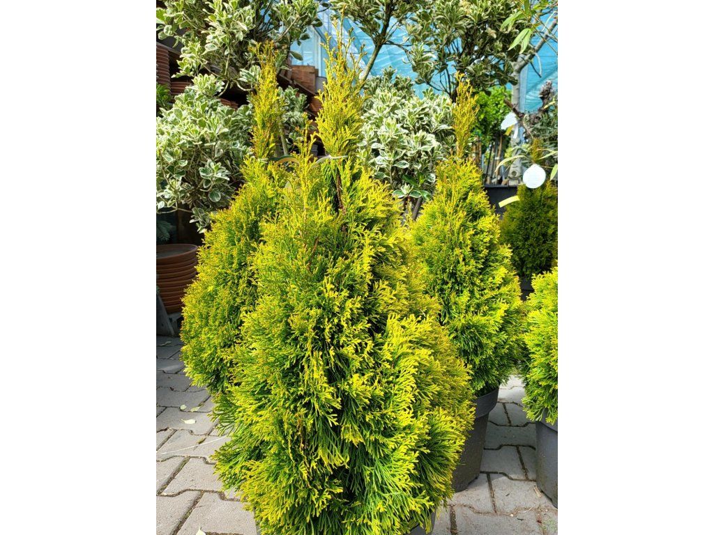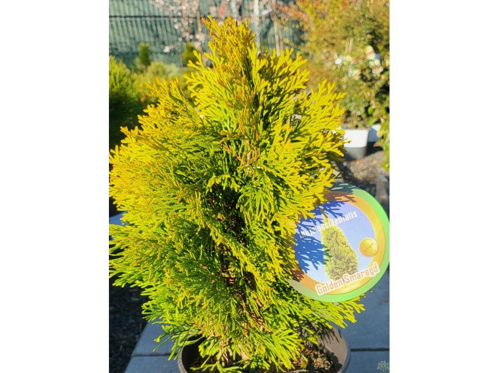Abendländischer Lebensbaum 'Golden Smaragd' - ein sehr beliebter Nadelbaum mit leuchtend goldgelber Färbung, die für diese Sorte typisch ist. Er zeichnet sich durch seine regelmäßige Form, sein langsames Wachstum und seine ganzjährige Attraktivität aus, weshalb er zu den am häufigsten gepflanzten Gehölzen für Gärten und städtische Anlagen gehört. Er wächst als schmal kegelförmiger bis säulenförmiger Baum, normalerweise 3 bis 5 Meter hoch und etwa 0,8 bis 1,2 Meter breit. Das Wachstum ist langsam und sehr regelmäßig, die Krone ist dicht und behält ihre Form auch ohne Schnitt. Die Äste sind aufrecht und eng aneinander gedrückt. Die Nadeln sind fein, schuppig, im Frühling und Sommer hell goldgelb, an sonnigen Standorten sehr auffällig. Im Schatten ist die Farbe eher gelbgrün. Im Winter behält die Sorte ihren goldenen Farbton, nur leicht nachdunkelnd, ohne das für einige andere gelbe Thujen typische Braunwerden. Er ist voll frostbeständig, widersteht gut Wind und städtischer Umgebung. Er eignet sich für Hecken, als Solitärgehölz, für Reihenpflanzungen, moderne Gärten, Vorgärten und repräsentative Bereiche. Dank seiner goldenen Farbe eignet er sich hervorragend zur Schaffung von Kontrasten zu dunkelgrünen Nadelgehölzen oder Laubbüschen.