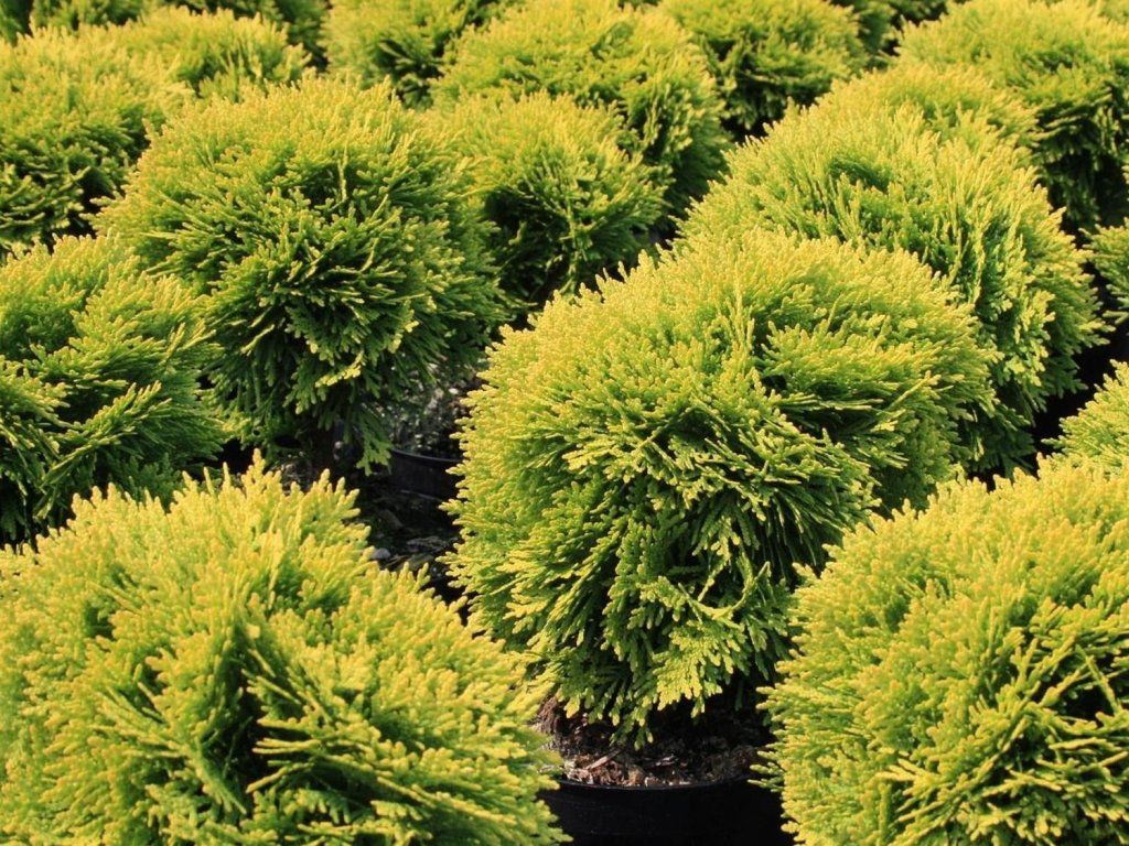 Abendländischer Lebensbaum 'Mirjam' - eine markante Zwergsorte mit natürlicher, kugelförmiger Wuchsform und sehr langsamem, gleichmäßigem Wachstum, die ihre kompakte Gestalt langfristig ohne Schnittpflege beibehält. Die Nadeln sind fein, dicht angeordnet und haben während der Vegetationsperiode eine tief goldgelbe Färbung, die sich mit dem Einsetzen des Herbstes und im Winter in warme Orange- bis Kupfertöne verwandelt, wodurch die Pflanze eine ausgeprägte saisonale Veränderlichkeit erhält. Etwa zehn Jahre nach der Pflanzung erreicht sie eine Höhe von etwa 50 cm, im ausgewachsenen Zustand liegt ihre Höhe und Breite in der Regel zwischen 80 und 90 cm. Der Kultivar zeichnet sich durch eine gute Frostbeständigkeit bis ca. −30 °C und ein stabiles Wachstum unter den Bedingungen der Tschechischen Republik aus. Dank ihrer geringen Größe und dekorativen Färbung eignet sie sich besonders für kleinere Gärten, Vorgärten und Steingärten, auch bei der langfristigen Kultivierung in Gefäßen ist sie sehr gut geeignet, wo sie als farblich markanter Solitär oder als Teil von Kompositionen mit dunkelblättrigen Gehölzen oder Stauden dient.