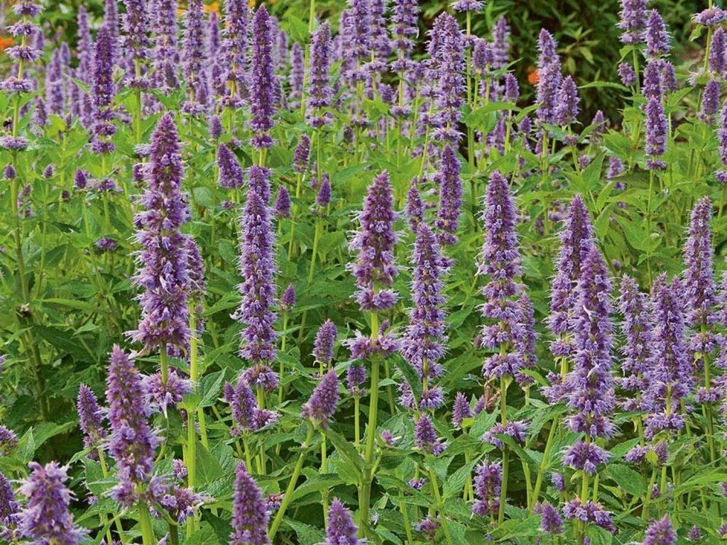 Agastache 'Blue Fortune' - eine auffällige aromatische Staude, die aus einer Hybridisierung entstanden ist und sich durch ihre lange Blütezeit und ihren texturierten, aufrechten Wuchs auszeichnet. Im ausgewachsenen Zustand erreicht sie eine Höhe von ca. 80–120 cm und eine Breite von 45–60 cm und bildet dichte Horste mit dunkelgrünen, gezähnten Blättern, die beim Berühren einen deutlichen Anisduft verströmen. Von Juli bis September ragen über den Blättern lange, schlanke Blütenähren mit zarten blauvioletten bis lavendelfarbenen Blüten empor, die eine reiche Farbtextur erzeugen und eine wichtige Nektarquelle für Bienen, Schmetterlinge und andere Bestäuber darstellen. Die Blüten behalten ihre Farbe lange und sorgen für einen vertikalen Akzent in sonnigen Staudenbeeten, in Prärieanpflanzungen und in Gärten, die auf Biodiversität ausgerichtet sind. Die Blätter sind essbar und werden traditionell wegen ihres ausgeprägten Aromas in Tees oder Salaten verwendet. Sie ist nach dem Einwurzeln trockenheitstolerant, außerdem ist sie vollständig frostbeständig und kann auch als Schnittblume in Hängen oder Behältern verwendet werden. Die empfohlene Pflanzdichte beträgt ca. 4–6 Pflanzen pro m² zur Schaffung eines kompakten Bestandes.