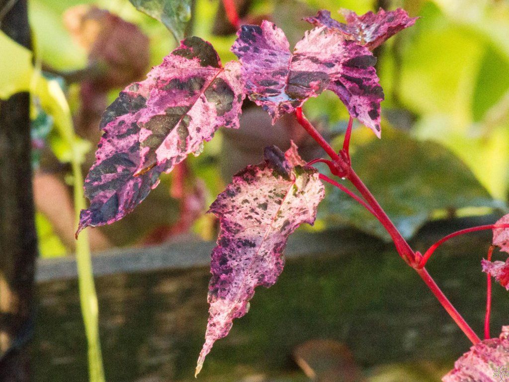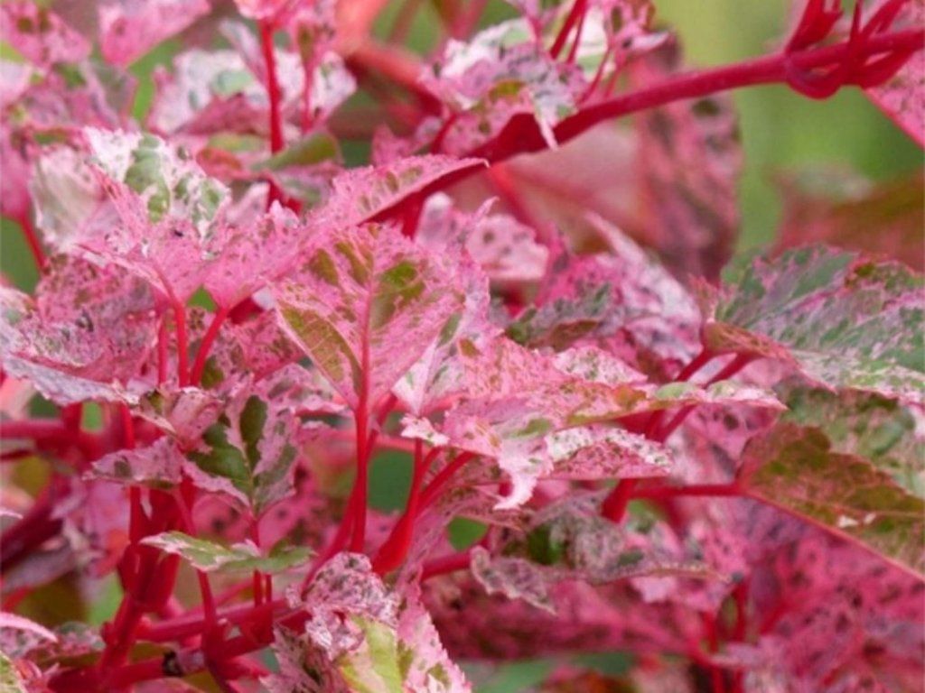 Acer x conspicuum 'Red Flamingo' – eine auffällige Sorte, die einen mittelgroßen Strauch oder kleineren Baum bildet. Er gehört zu den sogenannten Schlangenahornen, die für ihre gestreifte Rinde und dekorativen jungen Triebe geschätzt werden. Die Sorte stammt aus europäischer Selektion und wird als mehrstämmiger Strauch oder kleinerer Baum mit feinerer Verzweigung kultiviert. Im Frühling treiben die Blätter marmoriert weißgrün aus, oft mit einem rötlichen Schimmer, später gehen sie in Grün mit cremefarbener Panaschierung über. Im Winter fallen die rosa-roten Zweige auf, die allmählich die typische helle Streifung erhalten. Die Blätter sind 3–5lappig, meist 6–10 cm breit. Im April bis Mai erscheinen unscheinbare gelbgrüne Blüten in Rispen, im Herbst werden sie von geflügelten Nüsschen abgelöst. Die Rinde älterer Äste ist olivgrün bis grau mit weißen Längsstreifen, die im Winter am deutlichsten hervortreten. Dank guter Toleranz gegenüber städtischer Luft eignet er sich auch für Vorgärten und Gehwege, wo eine feine Krone ohne schweren Schatten willkommen ist. Im Herbst verfärbt sich das Laub oft in gelben bis ockergelben Tönen und verlängert den saisonalen Effekt.