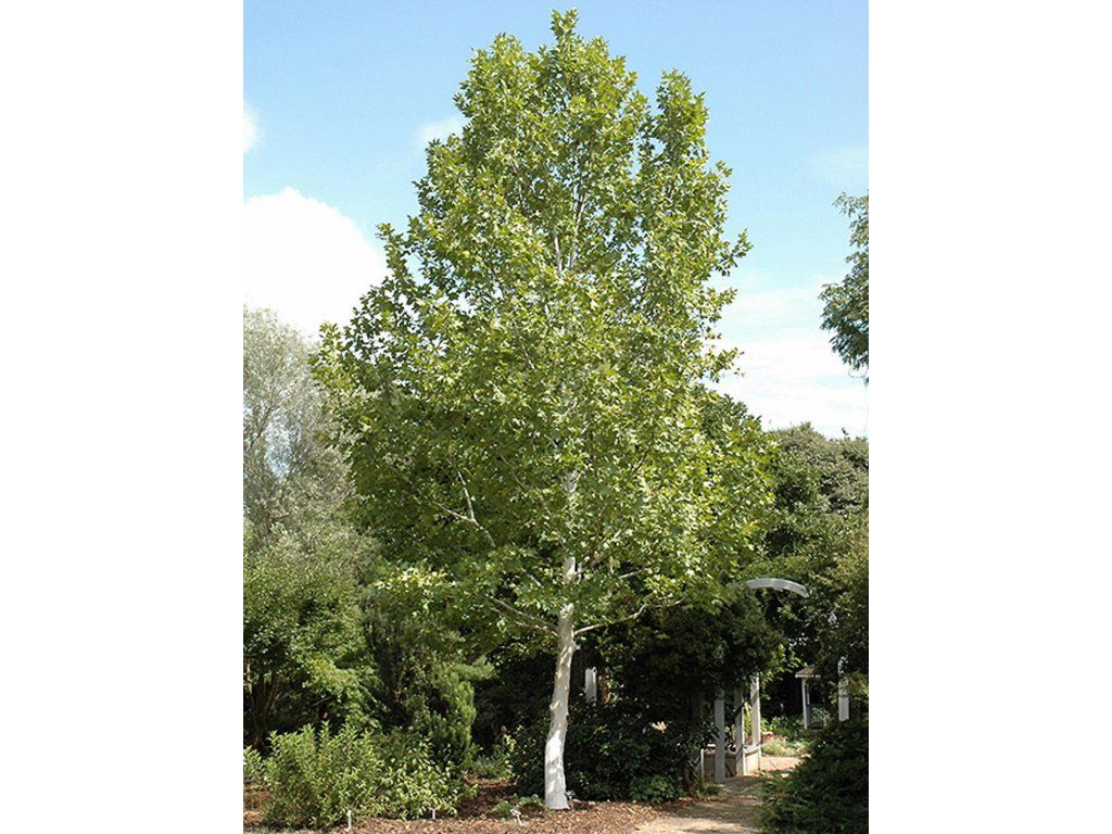 Ahornblättrige Platane ist ein imposanter Baum, der bis zu 25 m hoch wird. Große Blätter sind etwa 22 cm breit und ähneln in ihrer Form den Blättern eines Ahorns. Sie haben eine frische grüne Farbe und vergilben im Herbst, bedeckt mit feinen Härchen, die nach einiger Zeit verschwinden. Sie blüht im Mai mit unauffälligen, grünen Blüten, die zu stacheligen Kugeln heranreifen. Sie hängen den ganzen Winter über am Baum und wirken sehr dekorativ. Interessant ist auch die Rinde, die sich ablöst und somit den Stamm fleckig in den Farben Grau, Grün, Creme und Braun hinterlässt. Das Gesamtwachstum ist mittel bis schnell. Ein Vorteil ist, dass er verschmutzte Luft verträgt.