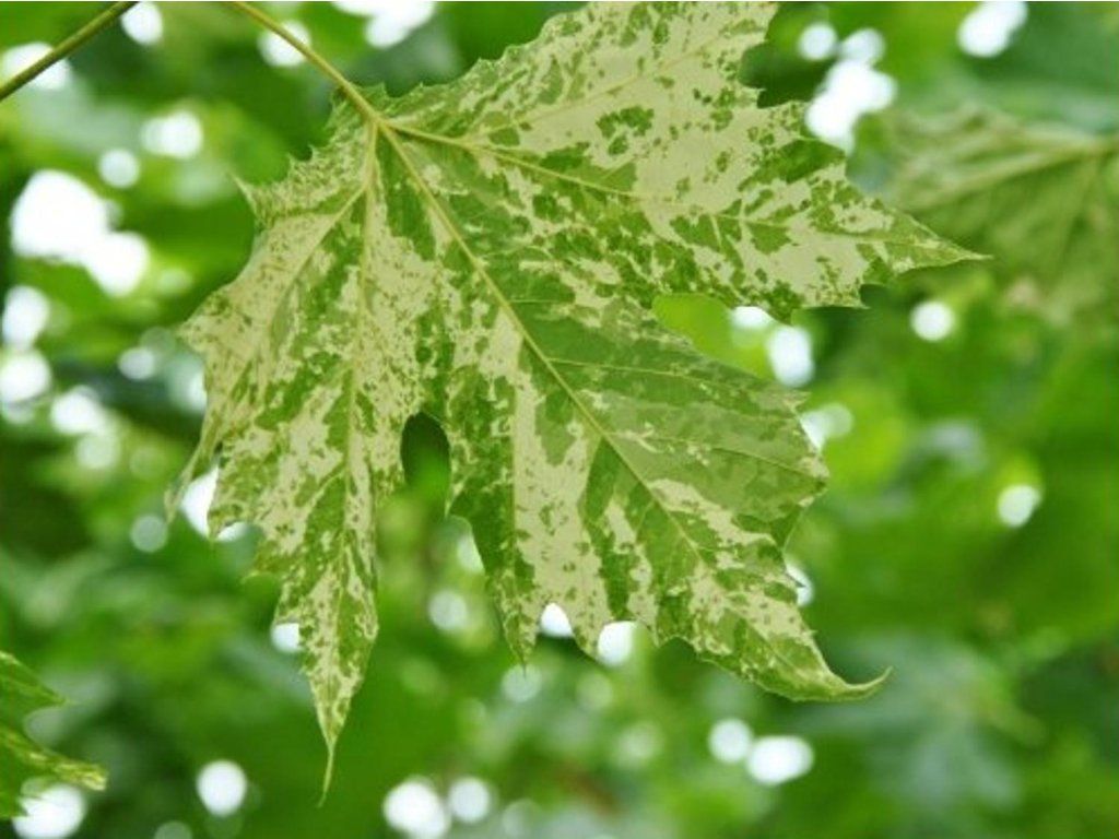 Ahornblättrige Platane 'Suttneri' - dank der Färbung seiner Blätter ist er ein leicht erkennbarer Kultivar, der einen weniger energisch wachsenden Baum mit einer breit-ovalen, halb offenen Krone bildet. Ausgewachsen erreicht er eine Höhe von 8-15 m. Handförmige, gelappte Blätter haben im Frühling eine zarte, grünrosa bis hellgrüne Farbe, im Sommer mit einer starken, cremeweißen Marmorierung. Im Herbst sind sie braun-gelb; die Blätter bleiben relativ lange am Baum.