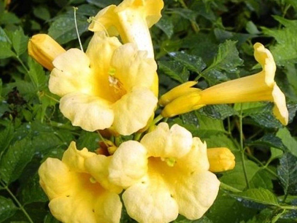Trompetenwinde 'Yellow Trumpet' - eine Sorte der Trompetenwinde mit auffälligen, röhrenförmigen gelben Blüten, die Bestäuber, insbesondere Bienen und Schmetterlinge, anziehen. Diese Sorte erreicht eine Höhe von 6 bis 10 Metern und eignet sich ideal zur Begrünung von Pergolen, Mauern oder Zäunen, wo sie einen üppigen und dekorativen Bewuchs bildet. Sie blüht von Juli bis September, wobei die leuchtend gelben Blüten einen schönen Kontrast zu den tiefgrünen, glänzenden Blättern bilden. Diese fallen im Herbst ab. Die Trompetenwinde ist frostbeständig und überwintert unter unseren Bedingungen problemlos. Diese Sorte ist wüchsig und pflegeleicht, es ist jedoch ratsam, sie regelmäßig zurückzuschneiden, um ihre kompakte Form zu erhalten und die Blüte zu fördern.