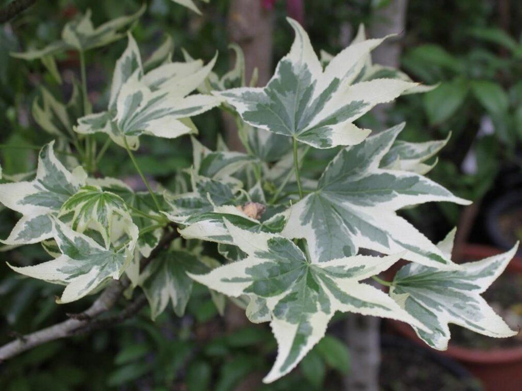 Amberbaum 'Albomarginata Manon' - ein sehr interessanter Amberbaum mit wunderschön gefärbten Blättern. Die Blätter sind 5-7-lappig, tief eingeschnitten und laubabwerfend. Sie haben eine dunklere grüne Farbe und die Ränder sind weiß-cremefarben panaschiert. Im Sommer wird diese Panaschierung rosa. Wenn sie an einem sonnigen Standort steht, nimmt das gesamte Blatt Rottöne an. Das Wachstum ist langsamer, erreicht eine Höhe von etwa 7 m und eine Breite von etwa 2 - 4 m. Es hat eine pyramidenförmige Form. Interessant sind sie auch wegen der Früchte. Es handelt sich um stachelige Kugeln mit einem Durchmesser von etwa 3 cm.
