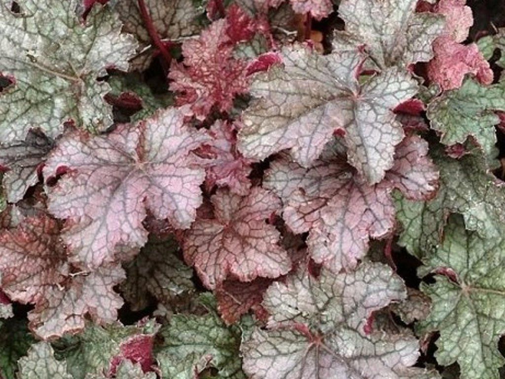Heuchera americana 'Can Can' - Eine immergrüne Staude, die eine Höhe von 30–60 cm erreicht. Rosa Blüten erscheinen von Juni bis August. Die Blätter sind herzförmig, flach mit gezackten und gewellten Rändern. Die robusten Blätter haben eine bronzefarbene und purpurne Färbung. Die Blattfarbe hängt vom Standort ab. Geeignet für die Pflanzung in Gruppen oder als Einfassung und zum Schnitt.