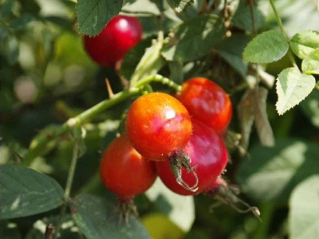 Apfelrose 'Karpatia' - beliebte, ertragreiche Obstrose. Wächst kräftig zu einem dichten, dornigen Strauch, der je nach Anbaubedingungen bis zu 2 m hoch und ca. 1 m breit wird. Ende Mai erscheinen einfache, mittelgroße Blüten in attraktiven Rosatönen. Von Mitte August bis Anfang September reifen die Früchte - längliche, leuchtend rote Hagebutten. Sie erscheinen meist in Büscheln - in Gruppen von zwei bis drei Früchten und sind mit einem kurzen Stiel versehen. Sie zeichnen sich durch einen ausgeprägten Geschmack und ein starkes Aroma aus. Ihre Reife muss überwacht werden, da sie nach dem Reifen nicht vom Strauch fallen. Sie sind ideal zum Trocknen oder zur Herstellung von Marmeladen, Säften oder Sirupen. Sie passen hervorragend in jede Gartengestaltung.