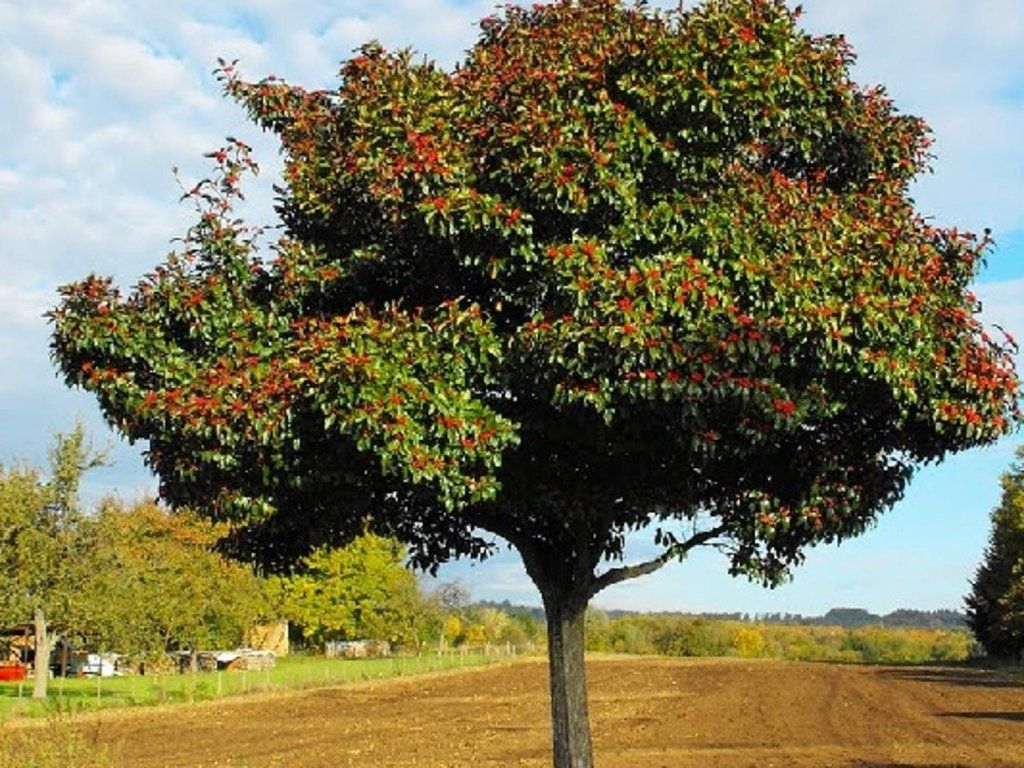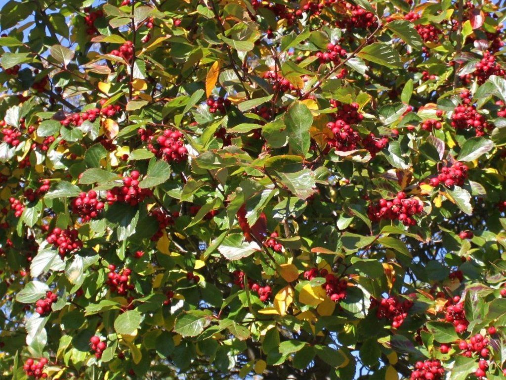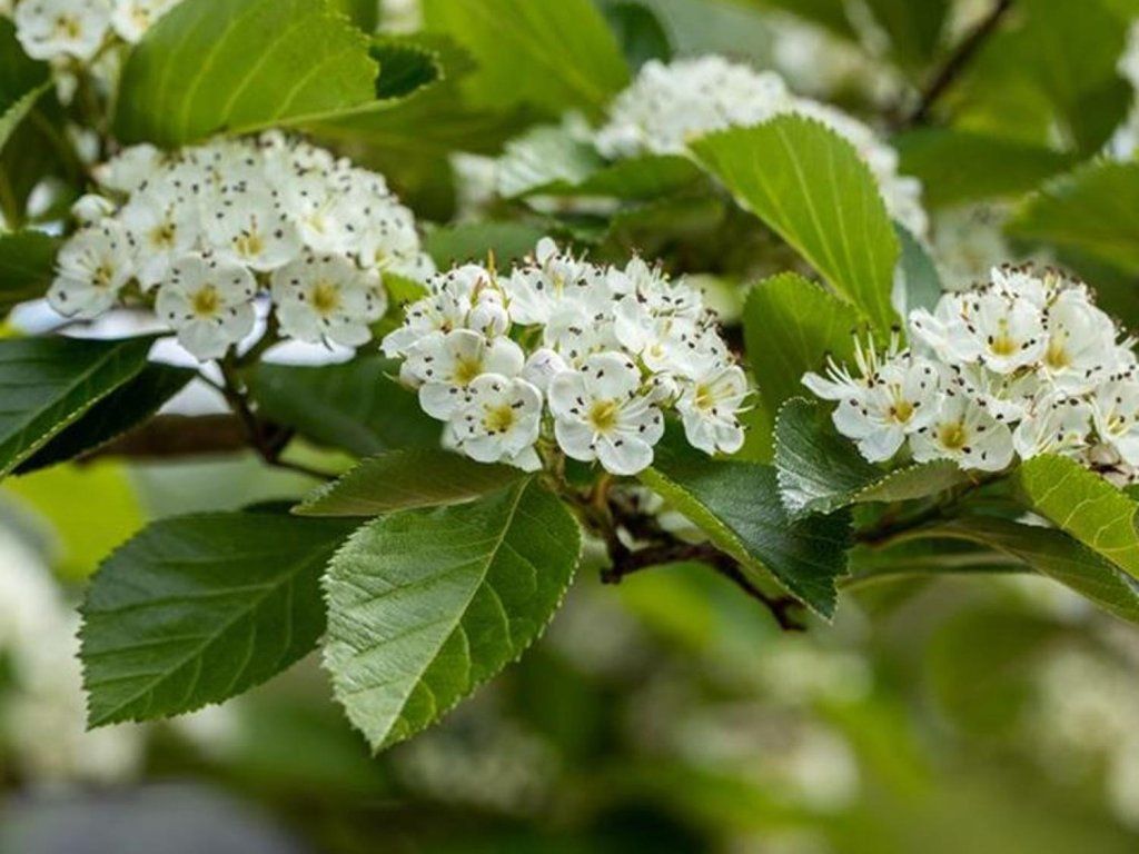 Weißdorn 'Carrierei' - eine Zierform des Weißdorns, die in der Praxis oft auch unter dem Namen Crataegus laevigata 'Carrierei' verkauft wird. Es handelt sich um ein widerstandsfähiges Gehölz aus der Familie der Rosengewächse (Rosaceae), das sich dank seiner dichten Krone und guten Toleranz gegenüber Trockenheit, Wind und Stadtluft sowohl in Gärten als auch in Straßenbepflanzungen bewährt. Er wächst als kleinerer Baum oder kräftigerer Strauch, im ausgewachsenen Zustand meist 5–7 m hoch und 4–5 m breit, mit zunächst aufrechtem, später unregelmäßig gerundetem Habitus. Das Wachstumstempo ist mittelschnell, etwa 20–35 cm pro Jahr, abhängig von Boden und Feuchtigkeit. Die Blätter sind ledrig, glänzend dunkelgrün, 5–10 cm lang, im Frühjahr an den Trieben mit einem rötlichen Schimmer und bleiben oft bis in den späten Herbst an den Zweigen, wo sie sich in roten und bronzefarbenen Tönen verfärben. Im Mai öffnen sich aus rosafarbenen Knospen weiße Blüten in Dolden von 4–6 cm, zart duftend und von Bienen gesucht; für empfindlichere Nasen kann der Duft bei warmem Wetter stärker sein. Im Herbst, normalerweise im September bis Oktober, reifen orange-rote Hagebutten, die bis in den Winter am Baum verbleiben können und eine wertvolle Nahrungsquelle für Vögel darstellen. Die Früchte sind nicht für den normalen Küchenverzehr bestimmt. Die Äste tragen Dornen, normalerweise 2–4 cm, daher wird der Baum außerhalb von engen Durchgängen und Kinderzonen platziert. In Kompositionen wirkt er als ganzjähriges Gerüst, das im Frühjahr mit Blüten das Beet aufhellt und im Herbst mit der Farbe der Blätter und Früchte, und ergänzt gut Schneeballsträucher, Hartriegel, Spiersträucher oder Ziergräser.