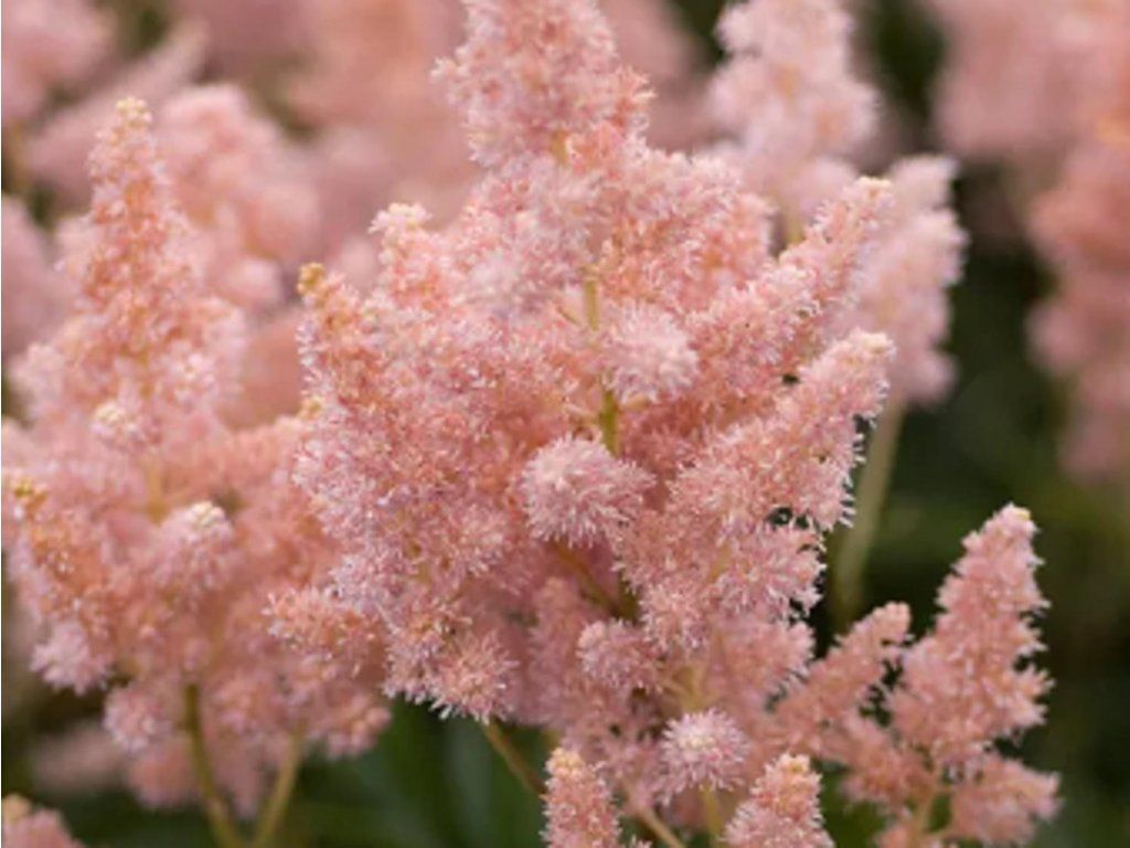 Astilbe Arendsii 'Sister Theresa' - eine kompakte Staude, die eine Höhe von 50 - 60 cm erreicht. Während der Sommermonate ist der obere Teil des geraden Stiels mit lachsrosa Blüten bedeckt, die in Rispen angeordnet sind. Die Blätter sind horstbildend, gesägt und schön grün gefärbt. Die Sorte wirkt sehr zart. Die Prachtspiere erhielt ihren Namen von den schönen Blüten, die an flauschige Vogelfedern erinnern. Sie istzum Schnitt geeignet. Sie eignet sich hervorragend für Gruppenpflanzungen und für Staudenbeete. Wir können sie in der Nähe von Wasserelementen pflanzen. Dank ihres ausgeprägten Blütenstands sticht sie auch in dunklen Ecken hervor. Sie macht sich gut mit anderen Prachtspieren. Sie ist ein ausgezeichneter Begleiter für Funkien, Bergenien, Purpurglöckchen, Christrosen und Goldkolben.
