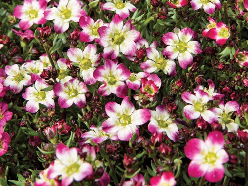 Saxifraga x arendsii 'Picotee Red' - Picotee ist eine niedrige, polsterbildende Sorte, die bis zu 20 cm hoch und 40 cm breit wird. Die Blüten sind rot-rosa mit einem cremefarbenen Zentrum. Blüht von März bis Mai. Geeignet für Steingärten, Mauern, usw.