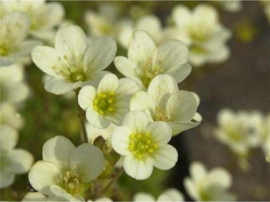 Steinbrech Arends 'Schwefelblüte' - eine Staude, die niedrige Polster bildet und eine Höhe von 5 - 20 cm und eine Breite von 15 - 25 cm erreicht. Die Blätter sind immergrün, mittelgrün, klein und sehen aus wie Nadeln. Das Gesamtwachstum ist kompakt. Schalenförmige Blüten stehen auf kurzen Stielen, die Blüten sind zartgelb und erscheinen von April bis Mai. Eine ideale Pflanze für Steingärten, Tröge oder Mauern.