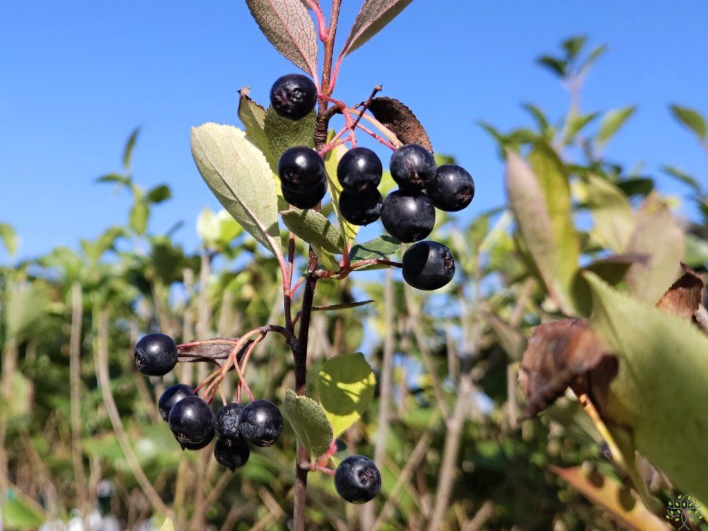 Aronie, Apfelbeere 'Hugin' - selbstfruchtbare Sorte eines laubabwerfenden Strauches, der eine Höhe von ca. 2 - 3 m und eine Breite von etwa 1 m erreicht. Blüht von April bis Mai, die Blüten sind schneeweiß und bilden Büschel. Die Blätter sind dunkelgrün und färben sich im Herbst in leuchtenden Orange- und Rottönen. Die Früchte haben einen ausgeprägt süß-säuerlichen Geschmack, sind aromatisch und reich an Vitamin C, B-Vitaminen, Vitamin E und Mineralstoffen wie Eisen und Kalium. Diese Sorte zeichnet sich durch hohen und regelmäßigen Ertrag aus. Die Beeren haben eine ausgeprägte dunkelviolette bis schwarze Farbe. Die Früchte eignen sich sowohl zum direkten Verzehr als auch zur Herstellung von Marmeladen, Sirupen oder Kompotten. Die Beeren erscheinen nach 2 bis 3 Jahren, je nach Stärke des Setzlings. Sie findet auch als lebende und essbare Hecke Verwendung. Wegen ihrer wunderschönen Blattfärbung wird sie auch als Solitärstrauch kultiviert. Der jährliche Zuwachs liegt bei etwa 10-25 cm je nach Kultivierung. Dank ihres kompakten Wuchses eignet sie sich für kleinere Gärten, für niedrigere freiwachsende Hecken und für Kübel auf Terrassen. In der Komposition bildet sie ein beständiges Gerüst mit Frühlingsblüten und einem ausgeprägten Herbsteffekt; sie lässt sich gut mit Felsenbirne, Preiselbeeren, Lavendel und Ziergräsern kombinieren.