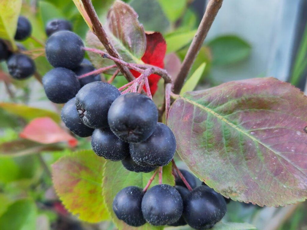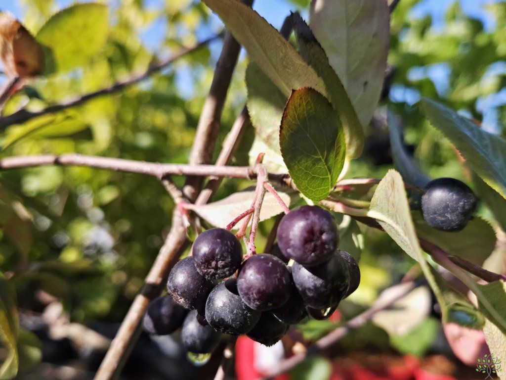 Aronia, Schwarze Eberesche 'Nero' - ein Zier- und Nutzkultivar, der durch Kreuzung von Aronia melanocarpa und Aronia prunifolia entstanden ist und ursprünglich aus dem östlichen Nordamerika stammt, wo die Apfelbeeren in Feuchtwäldern, an Wiesenrändern und in Gebüschsäumen wachsen. In europäischen Zuchtprogrammen hat sie sich als zuverlässiger Strauch für die Fruchtproduktion und für Hecken etabliert. Unter unseren Bedingungen wächst sie am häufigsten als Strauch von 1,5–2 m Höhe und etwa 1,5–2,5 m Breite, mit einem festeren, aufrechten bis leicht ausgebreiteten Wuchs und der Fähigkeit, Wurzelausläufer zu bilden. Die einfachen, elliptischen Blätter sind im Frühjahr frischgrün, im Sommer glänzend dunkelgrün und färben sich im Herbst gelb-orange, rot bis weinrot, sodass der Strauch auch nach der Ernte dekorativ wirkt. Ende Mai erscheinen aufrechte bis leicht überhängende Blütenstände aus kleinen weißen fünfzähligen Blüten, die frühen Nektar für Bienen und andere Bestäuber bieten. Die Sorte ist selbstfruchtbar, daher reicht eine einzige Pflanze zur Fruchtbildung aus, die Anwesenheit mehrerer Sträucher erhöht jedoch normalerweise den Fruchtansatz. Die Beeren sind runde Apfelfrüchte mit einem Durchmesser von etwa 7–10 mm, in Trauben von 10–20 Stück, bei Reife fast schwarz mit bläulich-violetter Bereifung. Unter unseren Bedingungen reifen sie meist von September bis Oktober. Das Fruchtfleisch ist dunkel violett-rot, saftig, säuerlich-süß mit leichter Bitterkeit, das an eine Kombination aus schwarzen Johannisbeeren und Blaubeeren erinnert. Die Früchte enthalten einen hohen Anteil an Vitamin C, Farbstoffen aus der Gruppe der Anthocyane und weitere wertvolle Stoffe, die in einer abwechslungsreichen Ernährung Anwendung finden. Sie eignen sich zum direkten Verzehr nach dem ersten Frost, für Marmeladen, Fruchtmus, Säfte, Sirupe, Fruchtzubereitungen für Tee, Kompotte und zum Trocknen, in der Küche harmonieren sie gut mit Äpfeln und Birnen.