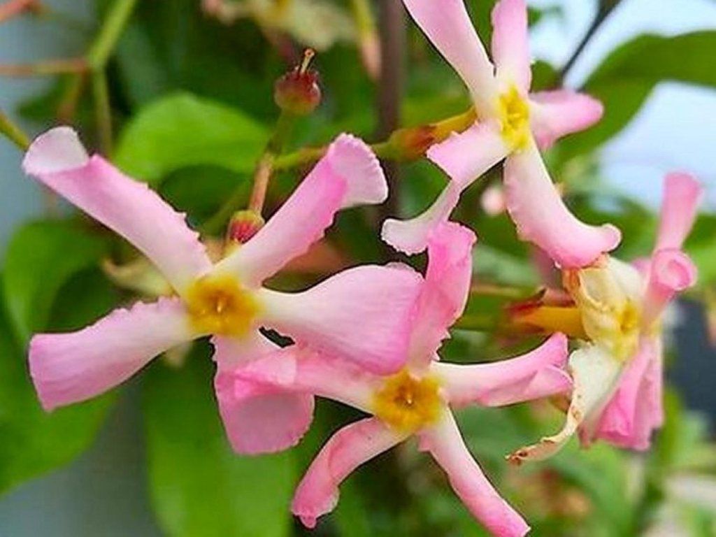 Asiatischer Jasmin 'Fleura Terrazza 'Pink' - besonders attraktive Sorte des asiatischen Jasmin oder Sternjasmin. Das Erste, was Sie an der Pflanze anzieht, sind natürlich ihre Blüten. Tiefrosa sternförmig mit gelben Zentren, die von Mai bis August reichlich erscheinen und wunderbar duften. Ausgewachsener Jasmin verträgt auch Temperaturen unter dem Gefrierpunkt bis zu -10°C. Sie benötigt eine Rankhilfe für ihr Wachstum.