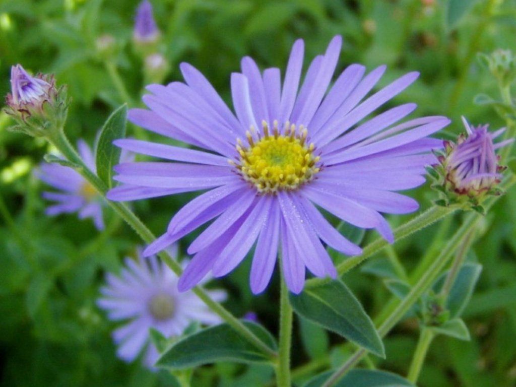 Aster 'Monch' - Hochwertige, anspruchslose, gegen Mehltau und Schimmel resistente Staude, sehr attraktiv für Bienen. Die Blüten haben schmale und lange Blütenblätter, lavendelblau gefärbt mit gelbem Zentrum. Sie blühen von Juni bis September. Breit lanzettliche Blätter sind tiefgrün. Sie wächst bis zu einer Höhe von etwa 50 cm. Besonders gut zur Geltung kommt sie in größeren Gruppen und in Gesellschaft anderer Pflanzen oder immergrüner Gehölze.