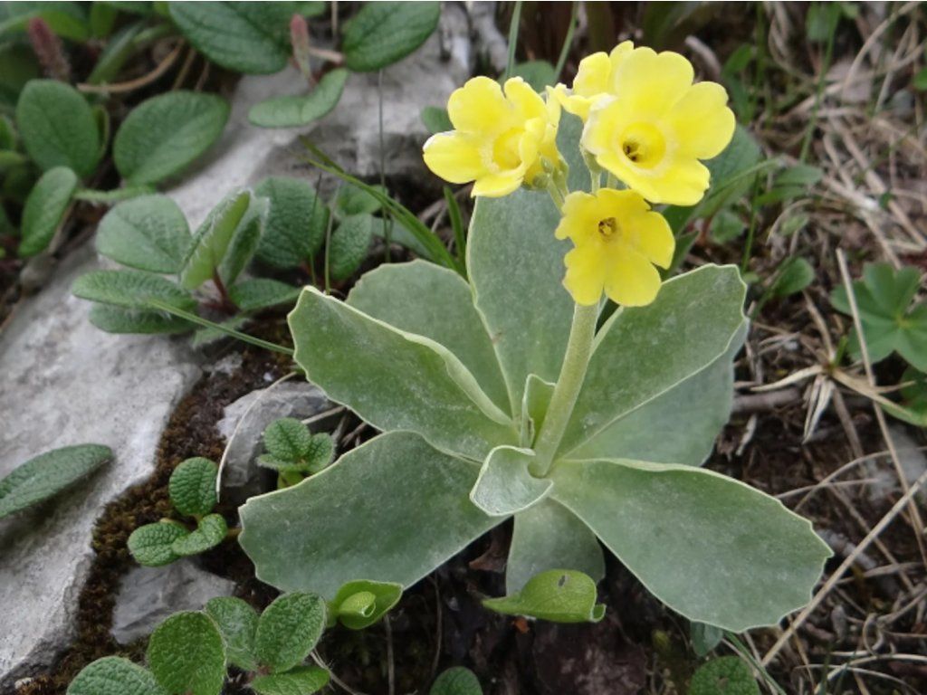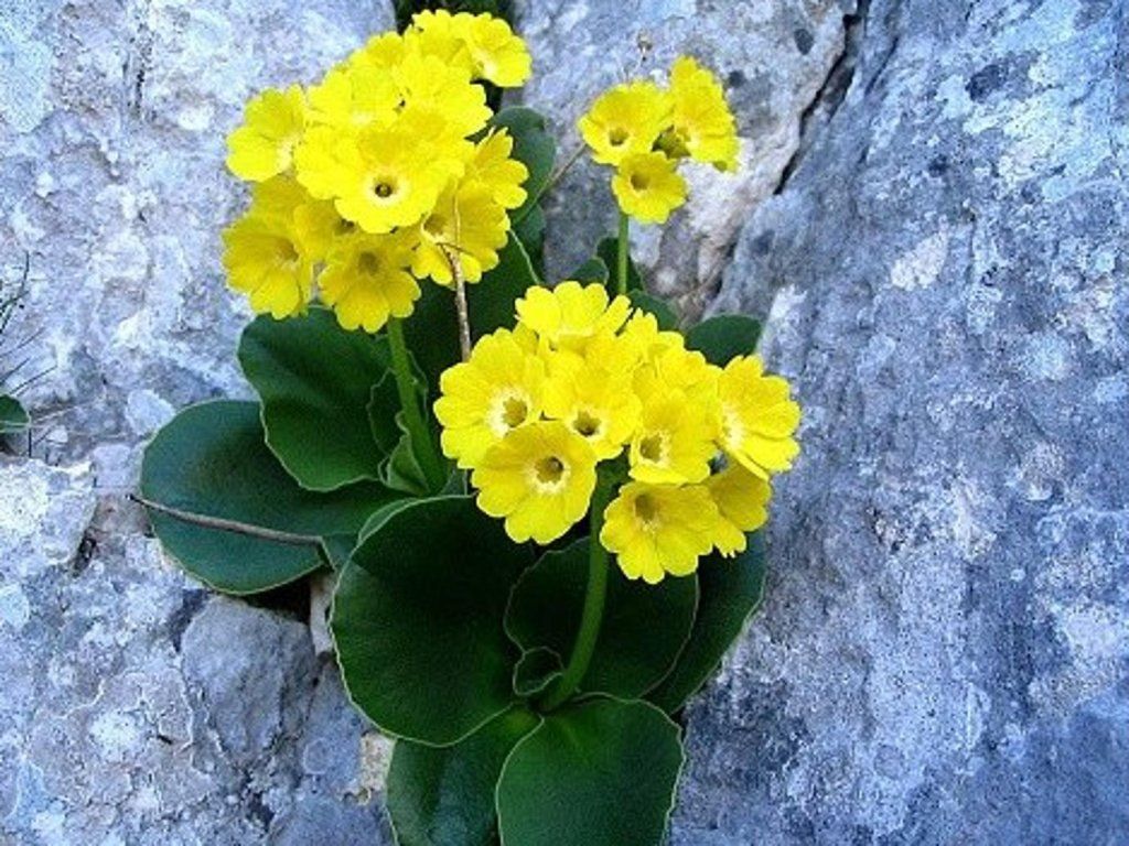 Alpen-Aurikel - eine ausdauernde Steingartenpflanze, ursprünglich von den kalkhaltigen alpinen Hängen und Felsen Mitteleuropas, wo sie in kühlerer, gut durchlüfteter Umgebung mit schnellem Wasserabfluss wächst. Gehört zur Gattung der Primeln, die für ihre frühe Blüte geschätzt werden. Im Garten bildet sie eine bodenständige, immergrüne Rosette aus ledrigen, oft leicht bereiften Blättern, die normalerweise 10–20 cm hoch und 15–25 cm breit ist. Die Blätter sind rundlich bis spatelförmig, mit einem glatten Rand und fester Textur, wodurch die Pflanze auch im Winter gepflegt aussieht. Im April und Mai wachsen kräftige Stiele, die einen Schirm aus mehreren trichterförmigen Blüten tragen, meist in rein gelber Farbe, die eine Höhe von 15–25 cm erreichen. Die Blüten werden von frühen Bestäubern gerne aufgesucht. Die Art eignet sich für Steingärten, Trockenmauern, Schotterbeete und Schalen, wo die Blätter wie ein grünes Kissen wirken und die Blüten sanftes Frühlingslicht hinzufügen. In Kompositionen harmoniert sie mit Steinbrech, Felsensteinkraut, Thymian, Hauswurz und feinen Schwingeln. Bei empfindlichen Personen kann der Saft der Blätter Hautreizungen verursachen. In Gärten wird sie oft mit niedrig wachsenden Frühlingszwiebelblumen kombiniert, um die Blütezeit zu verlängern.
