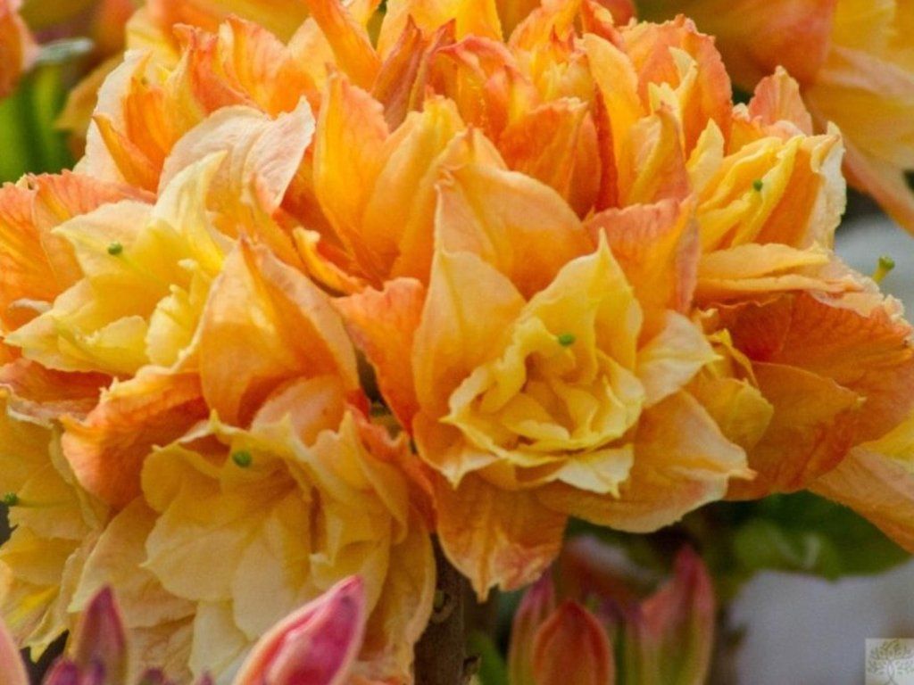 Azalea 'Csardas' - halbimmergrüner, kompakter Strauch, der relativ schnell und aufrecht wächst. Es handelt sich um eine gezüchtete, frostbeständige Sorte, die je nach Kulturbedingungen eine Höhe von bis zu 150 cm und eine Breite von 100 cm erreicht. Ein sehr attraktiv gefärbter Blütenstand schmückt den Strauch von Mitte Mai bis Mitte Juni. Große, weit geöffnete Blüten sind in der Knospe orange und entfalten sich zu einem goldgelben Farbton mit einem leichten Rosastich. Die Blätter sind weich, frischgrün und haben eine ovale Form. Wenn der Winter streng ist, fallen sie ab. Ideal für die Pflanzung in Behältern oder als Gruppenpflanzung.