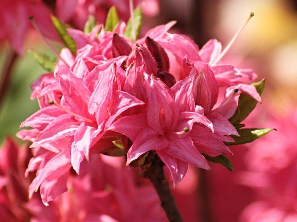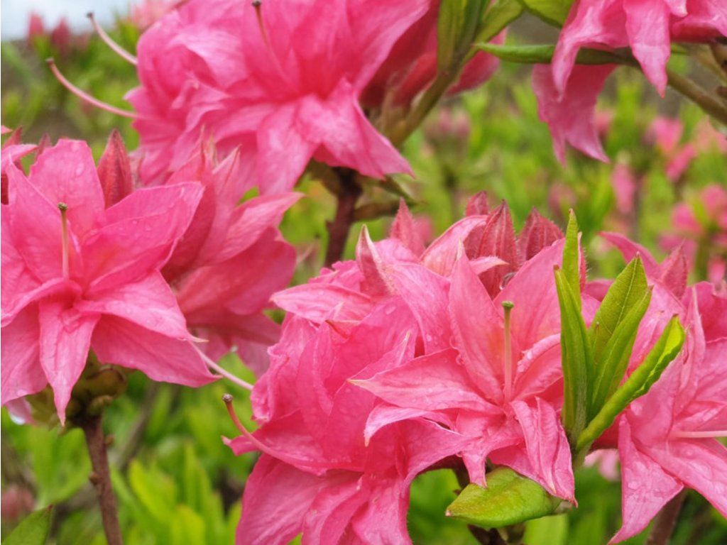 Azalea 'Homebush' - ein halbimmergrüner, höherer Strauch mit aufrechtem Wuchs. 'Homebush' gehört zu den laubabwerfenden, großblütigen Azaleen der Knap Hill Exbury-Gruppe. Sie wurde in England von A. gezüchtet. wurde in England von A. Waterer in der ersten Hälfte des 20. Jahrhunderts gezüchtet und zählt zu den bewährten Gartensorten. Unter unseren Bedingungen bildet sie einen mittelgroßen Strauch, der normalerweise 1,3–1,5 m hoch und 1,1–1,5 m breit ist; unter günstigen Bedingungen kann er mit der Zeit bis zu etwa 1,8 m wachsen. Das Wachstum ist anfangs aufrecht, später breitet der Strauch seine Äste seitlich aus und bildet eine dichtere, abgerundete Wuchsform. Die Blätter sind elliptisch, weich, beim Austrieb oft leicht kupferfarben, in voller Vegetation mittelgrün und färben sich im Herbst in Gelb-, Orange- bis Rottönen. Von Mai bis Juni trägt 'Homebush' dichte, kugelförmige Blütenstände, die aus halbgefüllten rosa Blüten bestehen und kleinen Blütenbällen ähneln. Die einzelnen Blüten sind trichterförmig und haben längere Staubgefäße, die aus der Krone herausragen, was den Blütenständen einen feineren, spitzenartigen Ausdruck verleiht. Der Duft ist süß, mittelstark und an wärmeren Tagen gut wahrnehmbar, wenn er Hummeln und andere Bestäuber anlockt. Wie alle Rhododendren enthält auch diese Azalee giftige Stoffe in ihren Geweben, daher wird sie nicht zum Verzehr verwendet und dient ausschließlich als Zierstrauch. In der Gartengestaltung eignet sich 'Homebush' als Solitärpflanze oder in Gruppen in Heidegärten oder Beeten, in Kombination mit immergrünen Rhododendren, Schneebällen, niedrigen Nadelgehölzen und Ziergräsern. sollten sich nicht erschöpfen.