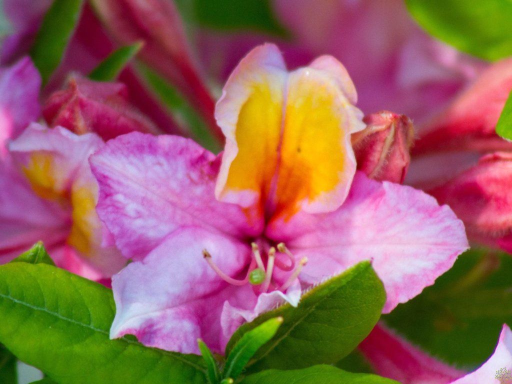 Azaleen gehören zur gleichen Gruppe wie die viel größeren Rhododendren. Im Gegensatz zu ihnen sind Azaleen kleiner (obwohl es auch größere Exemplare gibt) und einige Kultivare werfen im Herbst teilweise oder ganz ihr Laub ab. Während Rhododendren eher glockenförmige Blüten haben, ähneln die Blüten von Azaleen in ihrer Form einem Trichter. Für diejenigen, die nicht viel Platz haben, sind japanische Azaleen, die eher in die Breite als in die Höhe wachsen, absolut ideal. Die meisten Azaleen bevorzugen Teilsonne oder Halbschatten, da direkte Sonne zu Sonnenbrand führen kann und zu wenig Licht zu Vergeilung der Triebe und Blüten führt. Sie blühen von Mai bis Juni. Verblühte Blüten vorsichtig ausbrechen, damit der Strauch nicht weiter ausgelaugt wird.