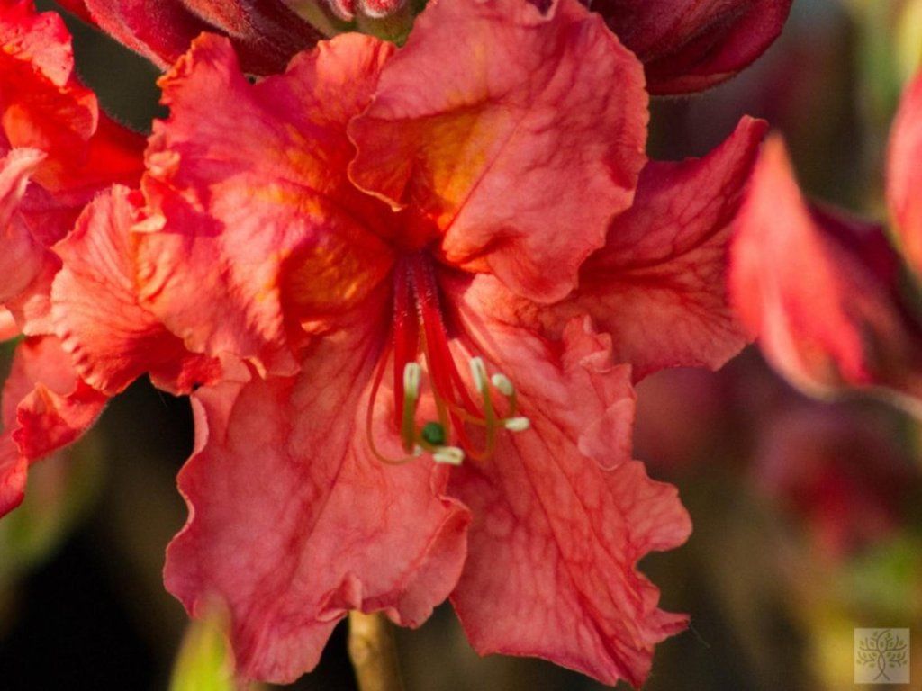 Azalee 'Sarina' - üppig wachsender, halbimmergrüner Strauch mit aufrechtem Wuchs. Es handelt sich um eine gezüchtete, voll frostbeständige Sorte, die je nach Kulturbedingungen eine Höhe von 150 - 200 cm und eine Breite von 120 - 150 cm erreicht. Reiche Blütenstände, die in kugelförmigen Büscheln angeordnet sind, schmücken den Strauch im Mai und Juni. Auffällige Blüten haben eine scharlachrote Farbe mit einer satten goldenen Zeichnung auf dem oberen Blütenblatt und sind leicht aromatisch. Die Blütenblattkanten sind leicht gewellt. Die Blätter sind länglich und frischgrün, im Herbst verfärben sie sich kupferrot. Wenn der Winter streng ist, fallen sie ab. Ideal für die Pflanzung in Behältern oder als Gruppenpflanzung.