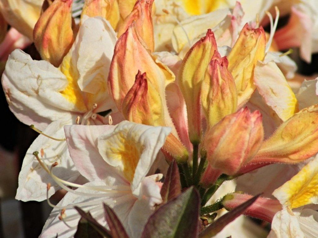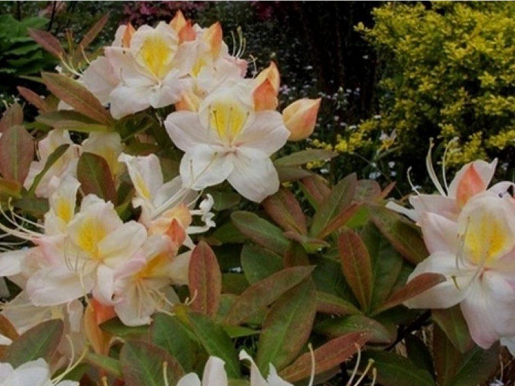 Azalea 'Silver Slipper' - halbimmergrüner, höherer, üppig wachsender Strauch mit kompakter Form. Es handelt sich um eine gezüchtete späte frostbeständige Sorte, die je nach Kulturbedingungen bis zu einer Höhe und etwa gleichen Breite von 200-250 cm heranwächst. Sehr intensive und reiche Blüte schmückt den Strauch bis Anfang Juni. Weit geöffnete, glockenförmige Blüten sind cremeweiß mit einem rötlichen Schimmer und einem gelben Fleck auf dem oberen Blütenblatt. Sie sind in kugelförmigen Büscheln von bis zu 10 Blüten angeordnet. Junge Blätter sind hellgrün und im Herbst bronzefarben. Wenn der Winter streng ist, fallen sie ab. Ideal für die Pflanzung in Behältern oder als Gruppenpflanzung.