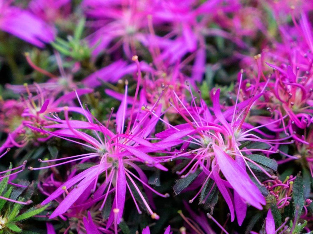 Azalea 'Starstyle Lila' - wie alle anderen Kultivare dieser Serie, ist sie das Ergebnis moderner Züchtung, die auf eine einzigartige Textur und eine architektonische Blütenform Wert legt, die sich deutlich von allem unterscheidet, was wir bisher von Azaleen kannten. Im Garten präsentiert sie sich als sehr niedriger, immergrüner Strauch mit außergewöhnlich dichter Verzweigung. Sie ist eine typische Zwergform, die im Erwachsenenalter selten höher als 50 Zentimeter wird. Ihr Habitus ist von Natur aus abgerundet und kompakt, sodass sie auch ohne regelmäßigen Schnitt eine gepflegte Form behält. Die Blätter sind klein, steif, schmal zugespitzt und von dunkelgrüner Farbe, die im Winter einen leicht bronzefarbenen Schimmer annehmen kann. Die Hauptblütezeit ist im April und Mai. Die Blüten haben die gleiche ikonische Form von schmalen, sternförmigen „Spinnen“-Spitzen, aber ihre Farbe ist bei diesem Kultivar zart lila bis lavendelfarben. Dieser Farbton wirkt im Garten sehr ruhig und elegant, besonders in Kombination mit weiß blühenden Pflanzen oder silbrigem Laub. Die Blüten bedecken die Pflanze so dicht, dass sie zur Hauptsaison ein kontinuierliches lila Kissen bilden. Sie findet Anwendung in modernen minimalistischen Gärten, asiatischen Kompositionen oder als ungewöhnliches Element in klassischen Heidegärten. Dank ihrer Farbe und Form ist sie absolut fantastisch in kombinierten Blumenkästen und Schalen auf Fensterbänken oder Gartentischen, wo ihre detailreichen Blüten nicht unbemerkt bleiben.
