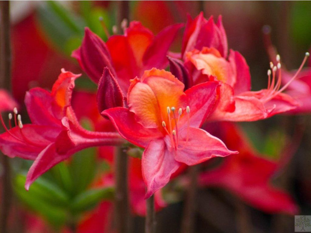 Azaleen gehören zur gleichen Gruppe wie die viel größeren Rhododendren. Im Gegensatz zu ihnen sind Azaleen kleiner (obwohl es auch größere Exemplare gibt) und einige Kultivare werfen im Herbst teilweise oder ganz ihr Laub ab. Während Rhododendren eher glockenförmige Blüten haben, ähneln die Blüten von Azaleen in ihrer Form einem Trichter. Für diejenigen, die nicht viel Platz haben, sind japanische Azaleen, die eher in die Breite als in die Höhe wachsen, absolut ideal. Die meisten Azaleen bevorzugen Teilsonne oder Halbschatten, da direkte Sonne zu Sonnenbrand führen kann und zu wenig Licht zu Vergeilung der Triebe und Blüten führt. Sie blühen von Mai bis Juni. Verblühte Blüten vorsichtig ausbrechen, damit der Strauch nicht weiter ausgelaugt wird.