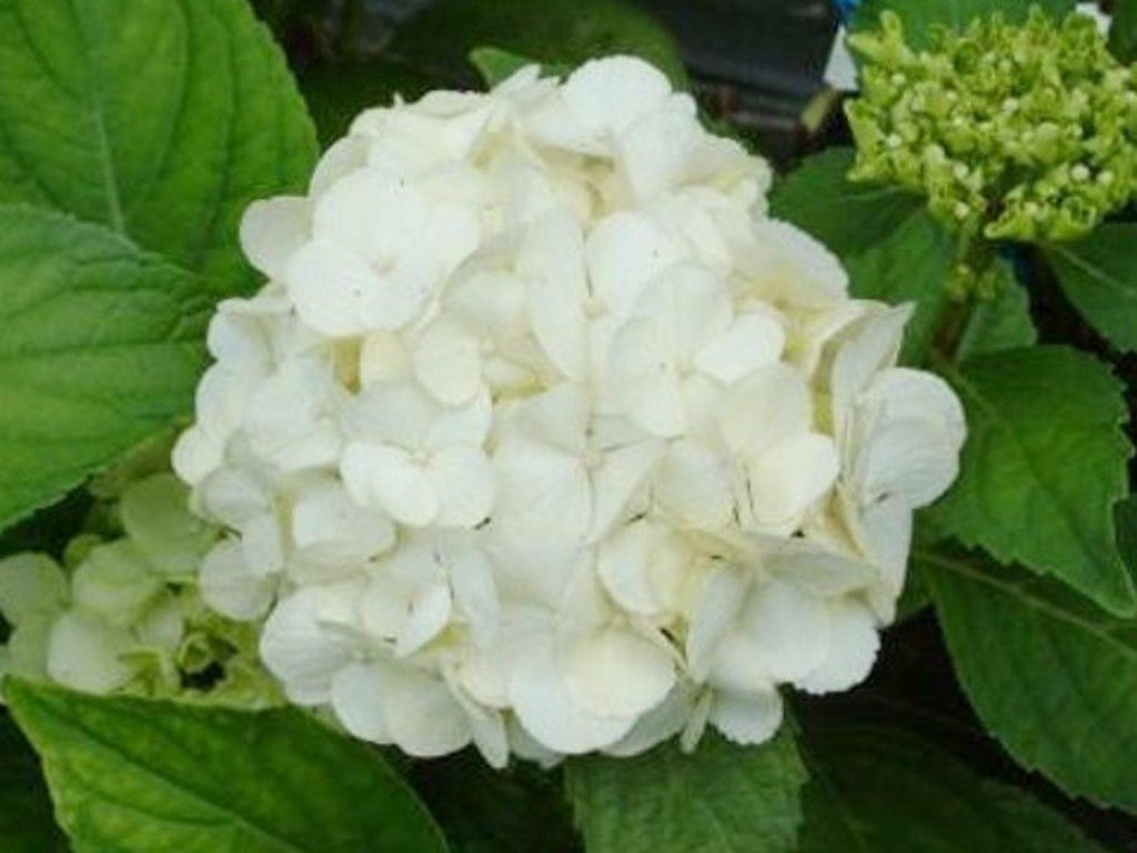 Bauernhortensie 'Ava Maria' - ein sehr schöner Hortensienkultivar, der sich seines prächtigen Blütenstandes rühmen kann. Im ausgewachsenen Zustand erreicht der Strauch eine Höhe von etwa 100 cm, wächst kompakt und gehört zu den laubabwerfenden Sträuchern. Die Rispen weiß-cremefarbener Blüten blühen von Juli bis September. Sie wird Ihren Garten den ganzen Sommer über schmücken. Die Blätter sind groß, herzförmig-eiförmig mit einer ausgeprägten Spitze. Dank seiner Höhe kann er auch im Topf kultiviert werden. Sie sieht in Kombination mit anderen Hortensienkultivaren sehr gut aus und eignet sich auch hervorragend als Solitärpflanze. Idealerweise wählen wir für die Pflanze einen Standort im Halbschatten. Die Bauernhortensie blüht am Holz des Vorjahres, daher entfernen wir im Frühjahr nur die durch Frost beschädigten Triebspitzen. Insgesamt ist die Hortensie ein beliebtes Element für Gärten und bringt ein zartes und erhabenes Aussehen in jeden Garten. Die Hortensie ist mittelschwer in der Pflege, bei richtigen Kulturbedingungen wird Ihnen mit üppiger Blüte gedankt.