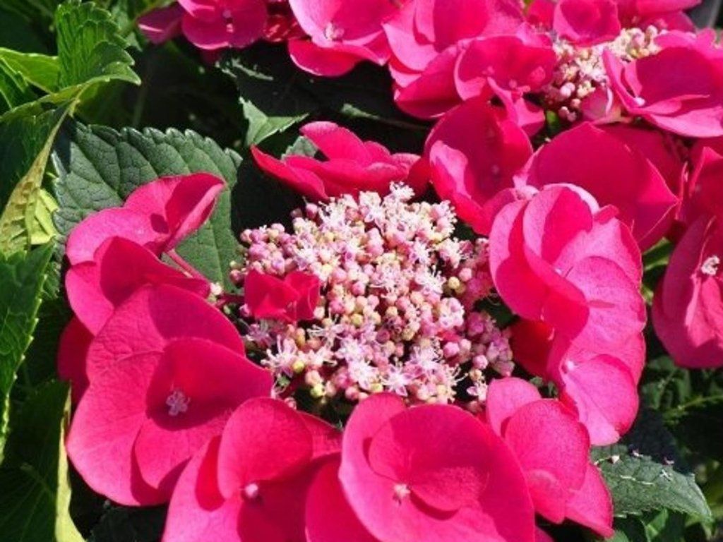 Bauernhortensie 'Cherry Explosion' - kleiner, laubabwerfender Strauch, der sich durch seinen auffälligen Blütenstand auszeichnet. Im ausgewachsenen Zustand erreicht er je nach Anbaubedingungen eine Höhe und Breite von etwa 80 - 90 cm. Der Habitus des Strauches ist kompakt und abgerundet. Der Strauch ist laubabwerfend. Die Blätter sind dunkelgrün, eiförmig und haben eine ausgeprägte Spitze. Große Blütenstände haben eine saftige, himbeerrosa Farbe. Die Blütezeit beginnt im Juni und dauert bis Oktober. Dieser Strauch eignet sich hervorragend als Solitär, aber auch im Garten, im Beet oder auf der Terrasse. Die Blütenfarbe hängt vom pH-Wert des Bodens ab. Saurerer Boden fördert die blaue Blütenfarbe, stärker basischer Boden hingegen die Rosafärbung. Die Bauernhortensie blüht am Holz des Vorjahres, daher entfernen wir im Frühjahr nur die durch Frost beschädigten Triebspitzen. Insgesamt ist die Hortensie ein beliebtes Element für Gärten und verleiht jedem Garten ein erhabenes und romantisches Flair.