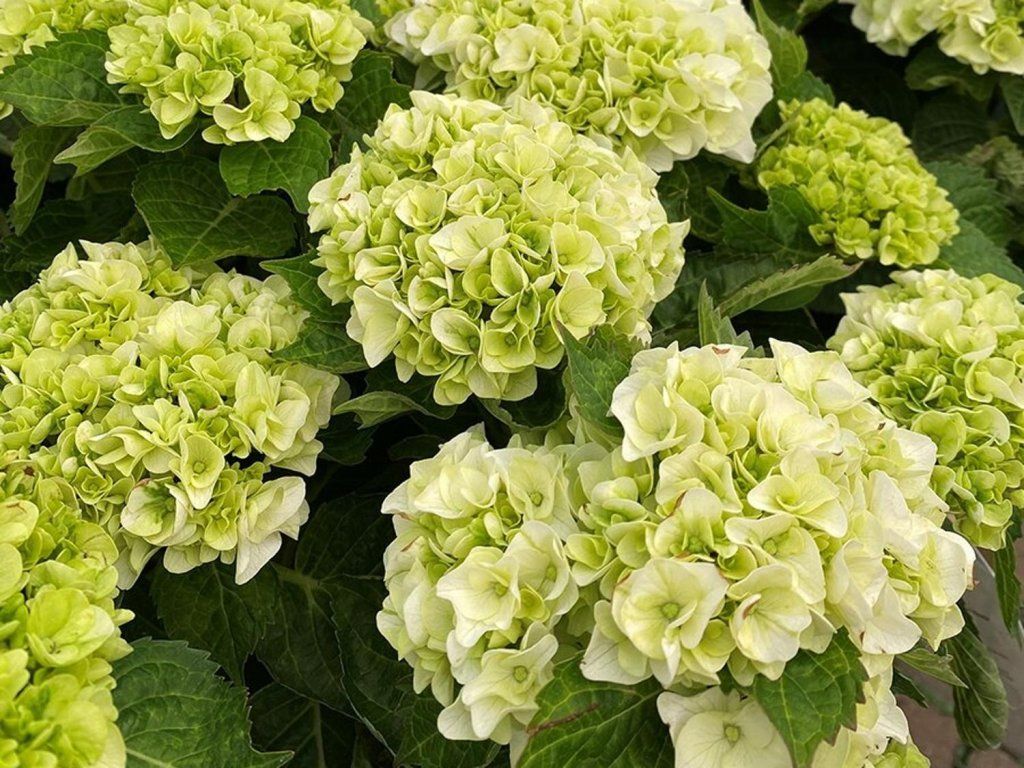 Bauernhortensie 'HI Hailstone' - eine neu gezüchtete Sorte der beliebten Hortensie, die sich durch üppige und langanhaltende Blüte auszeichnet. Sie bildet einen kompakten, gut verzweigten Strauch. Die Sorte erreicht standardmäßig eine Höhe von etwa 150 cm bei ähnlicher Breite, je nach Anbaubedingungen. Von Anfang Juni bis Oktober tragen die aufrecht wachsenden Triebe reiche, kugelförmige Blütenstände von weißer Farbe mit grünen Tönen, die einen großartigen Kontrast zu den großen, dunkelgrünen Blättern bilden. Sie kommt in einer Gruppenbepflanzung mit anderen Hortensien oder einzeln als Solitärpflanze, die auch im Kübel gezogen werden kann, hervorragend zur Geltung. Insgesamt ist die Hortensie ein beliebtes Element für Gärten und verleiht jedem Garten ein erhabenes und romantisches Flair. Die Hortensie ist mittelmäßig anspruchsvoll im Anbau. Wenn Sie ihr jedoch günstige Wachstumsbedingungen bieten, wird sie Sie mit kräftigem Wachstum und üppiger Blüte belohnen.