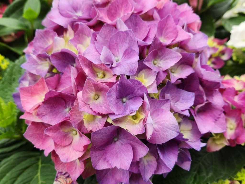 Bauernhortensie 'Ningbo' Violett - gehört zur Gruppe der Bauernhortensien mit ballförmigen Blütenständen. Die Sorte stammt aus dem niederländischen Züchtungsprogramm HOKO Breeding, wo die Serie Ningbo als kompakt, dicht verzweigt und auch für die Kübelkultur geeignet geführt wird. Im ausgewachsenen Zustand erreicht sie normalerweise eine Höhe von 80–100 cm und eine Breite von etwa 70–100 cm, unter günstigen Bedingungen auch mehr. Die Blätter sind breit eiförmig, stark gesägt, dunkelgrün und bilden einen ruhigen Hintergrund für die ballförmigen Blütenstände. Diese erscheinen von Juni bis September, bei geschützten Pflanzen auch länger, und wechseln während der Saison von einem grünlichen Hauch über ein sattes Rosa zu violetten Tönen. In saurerem Boden verschiebt sich die Farbe mehr ins Blauviolette, in weniger saurem ins Rosafarbene. Die Blüten sind einfach, aber der Blütenstand wirkt durch die dichte Anordnung der sterilen Blüten voll. Die Sorte eignet sich für Kübel, Vorgärten, kleinere Beete und zur feinen Begrenzung von halbschattigen Bereichen mit Funkien, Purpurglöckchen, Farnen oder niedrigeren Ziergräsern. In der Vase hält sie sich kurz, aber im Garten behält sie wochenlang ihre Farbe und erhält allmählich einen zart altrosa bis purpurnen Ton. Hortensien enthalten cyanogene Glykoside, daher sind sie nicht zum Verzehr bestimmt und beim Schneiden ist Vorsicht geboten.