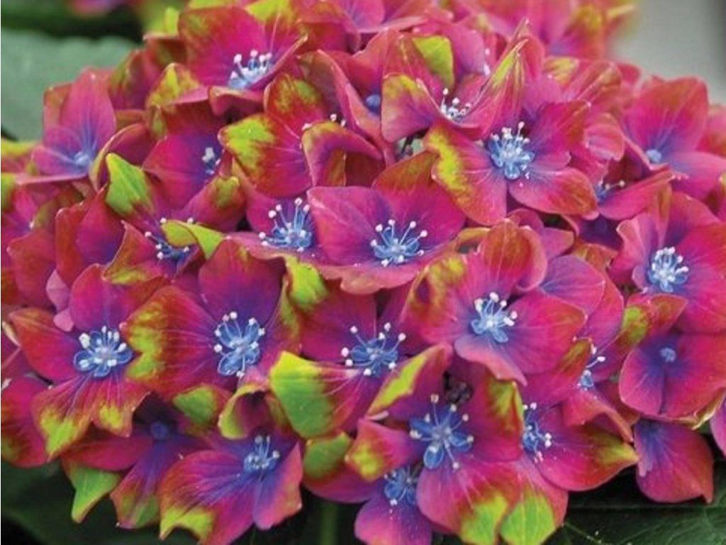 Hortensien der Sorte 'Schloss Wackerbarth' - ein laubabwerfender Strauch aus der Gruppe der Bauernhortensien, gezüchtet in der deutschen Serie Saxon für intensive Blütenfarben und eine feste Strauchstruktur. Die Pflanze erreicht im ausgewachsenen Zustand eine Höhe von etwa 120–130 cm und eine Breite von 110–120 cm, mit jährlichen Zuwächsen von etwa 15–25 cm. Der Strauch ist dicht verzweigt, mit steifen, aufrechten bis leicht gebogenen Trieben, die große Blütenstände ohne nennenswertes Nachlassen tragen. Die Blätter sind breit-eiförmig, 10–15 cm lang, tiefgrün, am Rand gesägt, auf der Unterseite heller mit gut sichtbarer Blattaderung. Von Juli bis Herbst erscheinen an den Triebspitzen kugelförmige Blütenbälle mit einem Durchmesser von etwa 15–18 cm. Einzelne Blüten haben rote bis himbeerfarbene Ränder, die Mitte färbt sich in blau-violette Töne, in späteren Blühphasen gehen die Ränder allmählich in olivgrüne Farbtöne über. Diese Farbveränderlichkeit macht die Sorte zu einem auffälligen Element im Beet, wobei einzelne Blütenstände gleichzeitig verschiedene Farbstadien aufweisen. Die Blüten sind überwiegend steril, daher bleiben sie lange am Strauch, eignen sich auch gut für den Schnitt und nach dem Trocknen. In der Komposition passt sie gut zu zart blühenden Stauden, schattenliebenden Gräsern und Farnen, und ergänzt sich gut mit weiß oder hellrosa blühenden Hortensiensorten. Diese Hortensie darf in keiner Sammlung von Hortensienliebhabern fehlen.