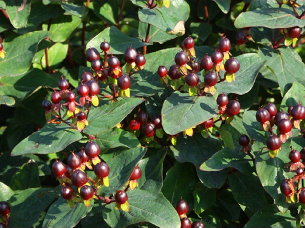 Duftloses Johanniskraut 'Black Berry' - attraktiver, neu gezüchteter Johanniskraut-Kultivar, der ungewöhnliche, tief rot-schwarze, glänzende Früchte trägt. Er erreicht eine Höhe von etwa 100 cm und bildet einen kompakten, gut verzweigten und dicht belaubten Strauch. Von Mai bis Juni blüht er reichlich mit kleineren, einfachen gelben Blüten mit auffälligen Staubgefäßen. Diesen folgen dann Beeren, die mit der Zeit dunkler werden und die Pflanze bis in den späten Herbst schmücken. Sie ist eine ausgezeichnete Wahl für jede Gruppenbepflanzung und eignet sich für den Anbau im Topf.
