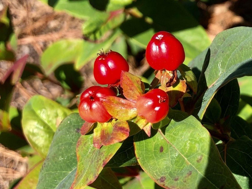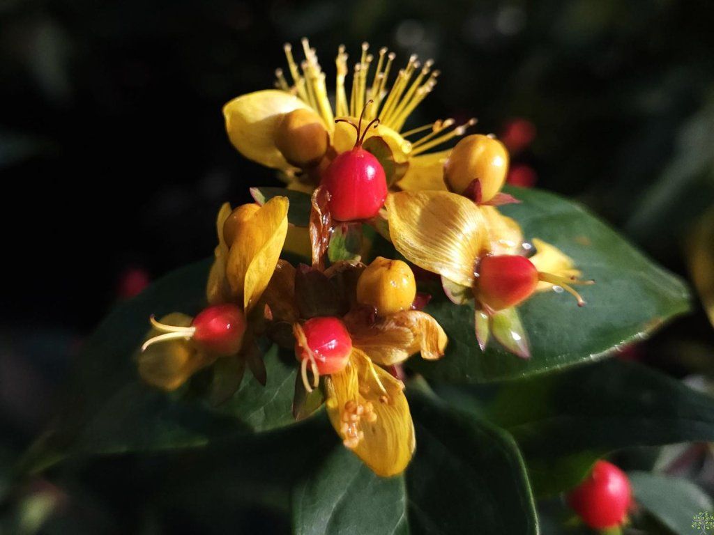 Johanniskraut 'Red Berry' - ein schöner, neu gezüchteter Johanniskraut-Kultivar, der ungewöhnliche, leuchtend rote, glänzende Früchte trägt. Er erreicht eine Höhe von etwa 100 cm und bildet einen kompakten, gut verzweigten und dicht belaubten Strauch. Von Mai bis Juni blüht er reichlich mit kleineren, einfachen gelben Blüten mit auffälligen Staubgefäßen. Diesen folgen dann Beeren, die mit der Zeit dunkler werden und die Pflanze bis in den späten Herbst schmücken. Sie ist eine ausgezeichnete Wahl für jede Gruppenbepflanzung und eignet sich für den Anbau im Topf.