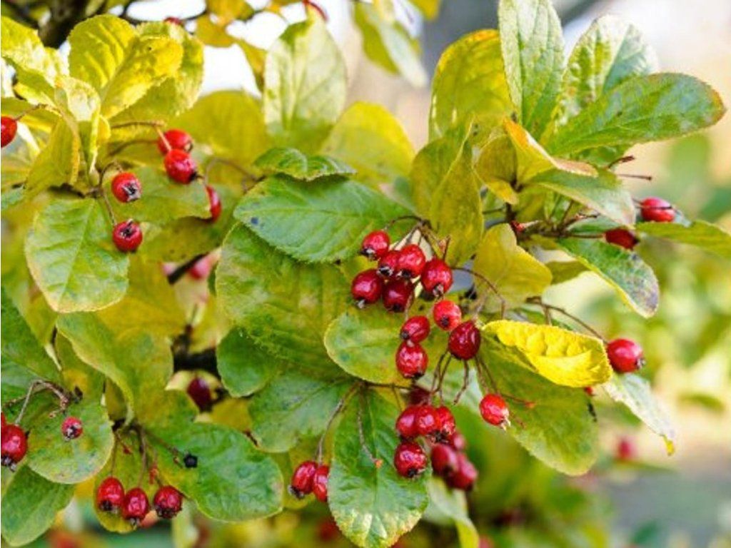 Glanzmispel-Blutbeere - ein langsam wachsender, reich verzweigter Strauch, der eine Höhe von 2-3 Metern erreicht. Die Blätter sind breit-oval, ziemlich steif, leicht filzig und leicht behaart. Beim Austreiben sind sie kupferfarben, dann tiefgrün. Im Herbst verfärben sie sich gelb, orange, rot bis purpur. Büschel reinweißer Blüten blühen im Frühling. Es folgen kleine, rote Beeren. Sie sind weder essbar noch giftig. Auch ohne Schnitt verzweigt sie sich sehr schön, oder sie kann im Frühjahr geformt werden. Sie ist gut frostbeständig.