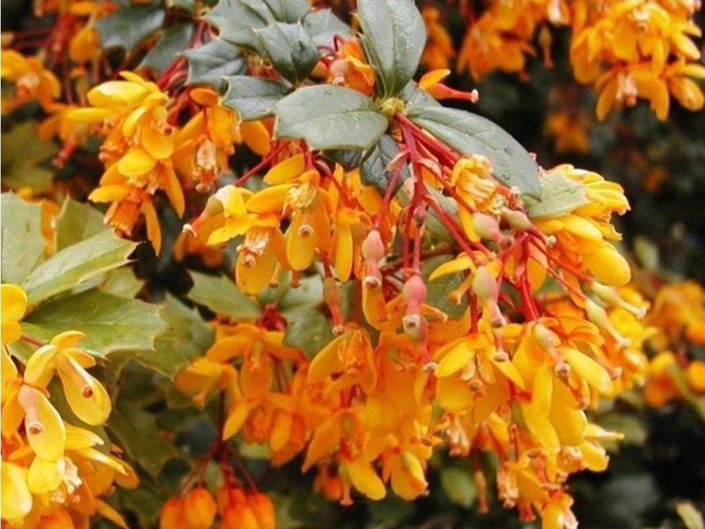 Berberitze x lologensis 'Apricot Queen' - mittel schnell wachsende Strauch mit unregelmäßigem Wuchs. Erreicht eine Höhe und Breite von 1-3m. Er hat immergrüne, kleine, dunkelgrüne Blätter, die an Stechpalmenblätter erinnern. Attraktiv sind die leuchtend gefärbten Blüten im Mai. Diese sind klein, in kleinen Trauben angeordnet und haben eine goldorange Farbe. Sie blühen im Laufe von 4 Wochen. Ende des Sommers bilden sich purpurrot bis blauviolett gefärbte Beeren.