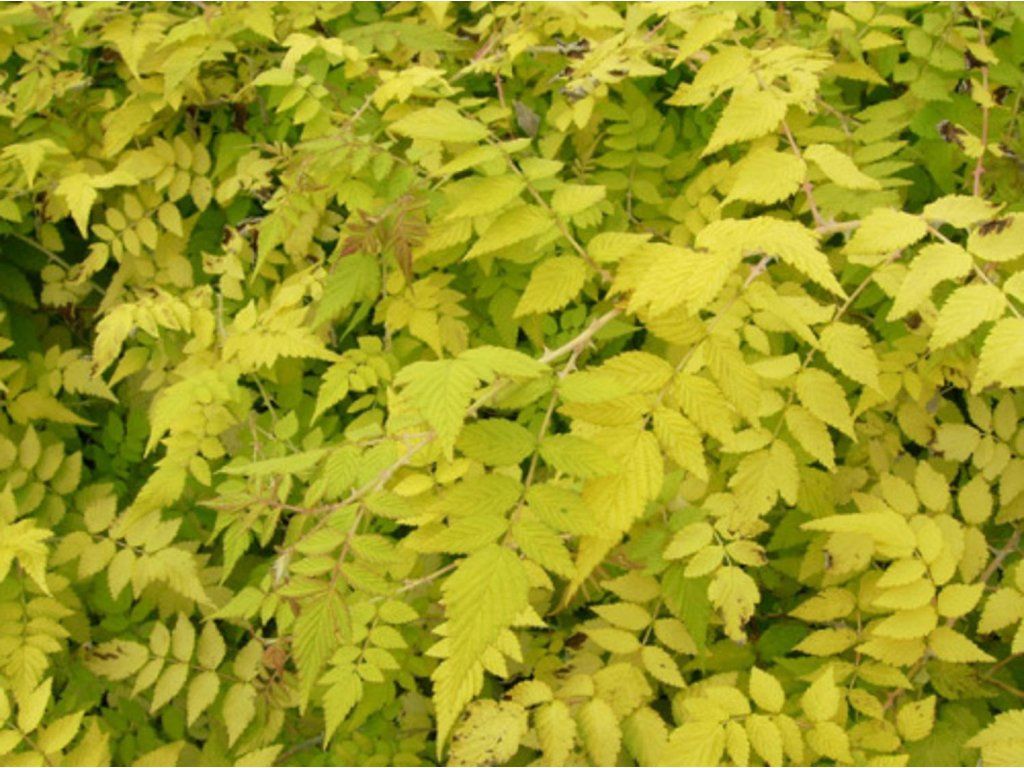 Brombeere 'GOLDEN VALE' 'Wyego' - dichter Strauch, der bis zu 1-1,5m hoch wird. Zerbrechliche Zweige sind leicht gewölbt. Die Blätter sind gefiedert, bis zu 20 cm lang. Nach dem Austrieb sind sie goldgelb mit braunem Rand, später zitronengelb. Ende Mai/Anfang Juni erscheinen kleine purpurrosa Blüten. Die Früchte sind kugelförmig und schwarz.