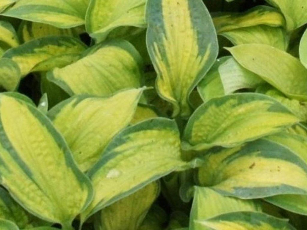 Hosta montana 'Super Nova' - die Blätter der Sorte haben eine goldgelbe Mitte, die Blattränder sind dunkelgrün mit einem bläulichen Stich. Wächst bis zu einer Höhe von 80 cm, einschließlich der Blüte. Blüht von Juni bis August mit hellen Blüten.