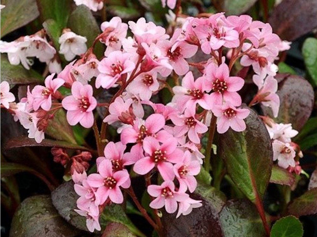Bergenie 'Pink Dragonfly' - beliebte Bodendecker- oder Randstaude. Sie wird 25 bis 60 cm hoch. Die Blütenstände sind wunderschön rosa, zusammen mit den rotvioletten Blättern wirkt sie sehr schön. Blüht von März bis April. Wir pflanzen sie im Halbschatten, sie benötigt feuchtere, humusreiche Böden, verträgt auch vorübergehende Trockenheit. Wenn sie längere Zeit trocken ist, verfärben sich die Blätter rotviolett. Geeignet zum Schnitt, sowohl für Blüten als auch für Blätter. Geeignet für Steingärten, Blumenbeete, Ufer von Wasserreservoirs, unter Bäumen als lichter Bewuchs, für mobile Bepflanzung, zum Schnitt in Gefäßen.