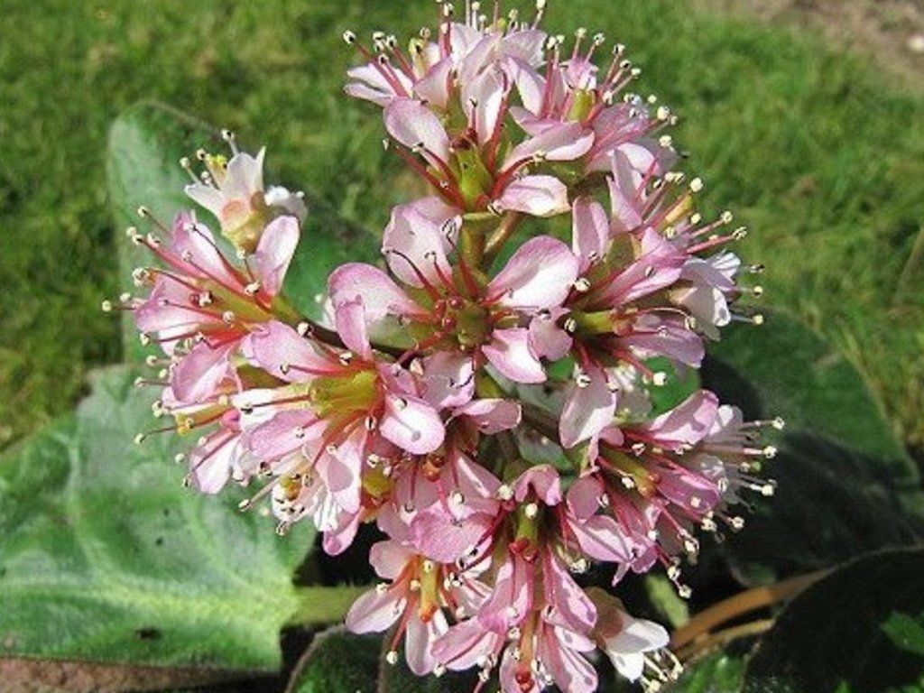 Bergenia ciliata 'Dumbo' - eine schöne, kompakt wachsende Staude. Wird etwa 40 cm hoch. Blüht im Frühjahr. Die Blüten sind zunächst hellrosa, später dunkler rosa gefärbt. Die Blätter sind groß, fein behaart und ähneln Elefantenohren. Im Herbst haben sie einen rötlichen Farbton. Diese Sorte ist teil- bis laubabwerfend. Als Solitär oder als Teil eines Staudenbeetes kommt sie hervorragend zur Geltung. Sie sieht interessant aus in Kombination mit Frühlingszwiebelblumen oder Ziergräsern.