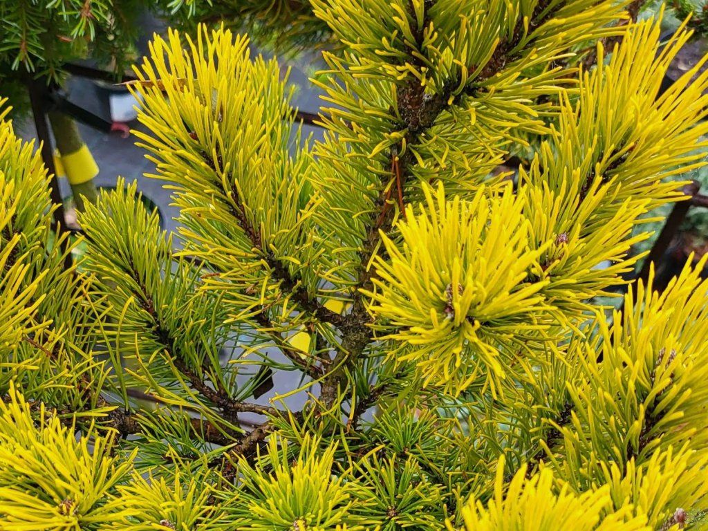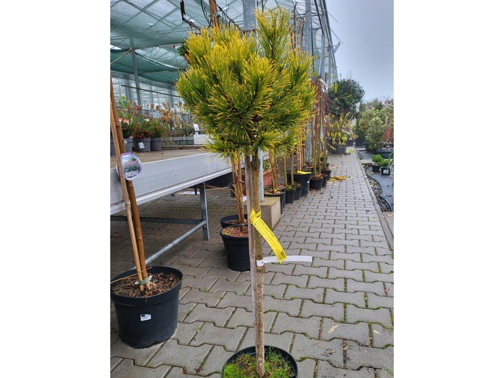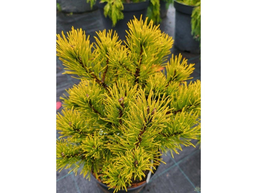 Bergkiefer 'Carsten's Wintergold' - langsam wachsende Bergkiefernart, die je nach Kulturbedingungen eine Höhe und Breite von etwa 1 m erreicht. Der Habitus ist kugelförmig, bildet einen dichten und niedrigen Strauch. Ein Rückschnitt ist nicht notwendig. Die Nadeln sind steif, die Grundfarbe ist tiefgrün, aber von Mitte des Frühlings bis Anfang des Herbstes nehmen sie eine gelbe Färbung an. Sobald der Winter einsetzt, leuchten die Nadeln buchstäblich in einem tiefen Gelb bis Goldton, diese Färbung behalten sie bis zum Frühling. Die Nadeln wachsen zu zweit in Büscheln. Mag keine Staunässe. Sie wird für Steingärten, Heidegärten, Staudenbeete, aber auch für Kübel verwendet. Absolut frostbeständig bis ca. -40°C.