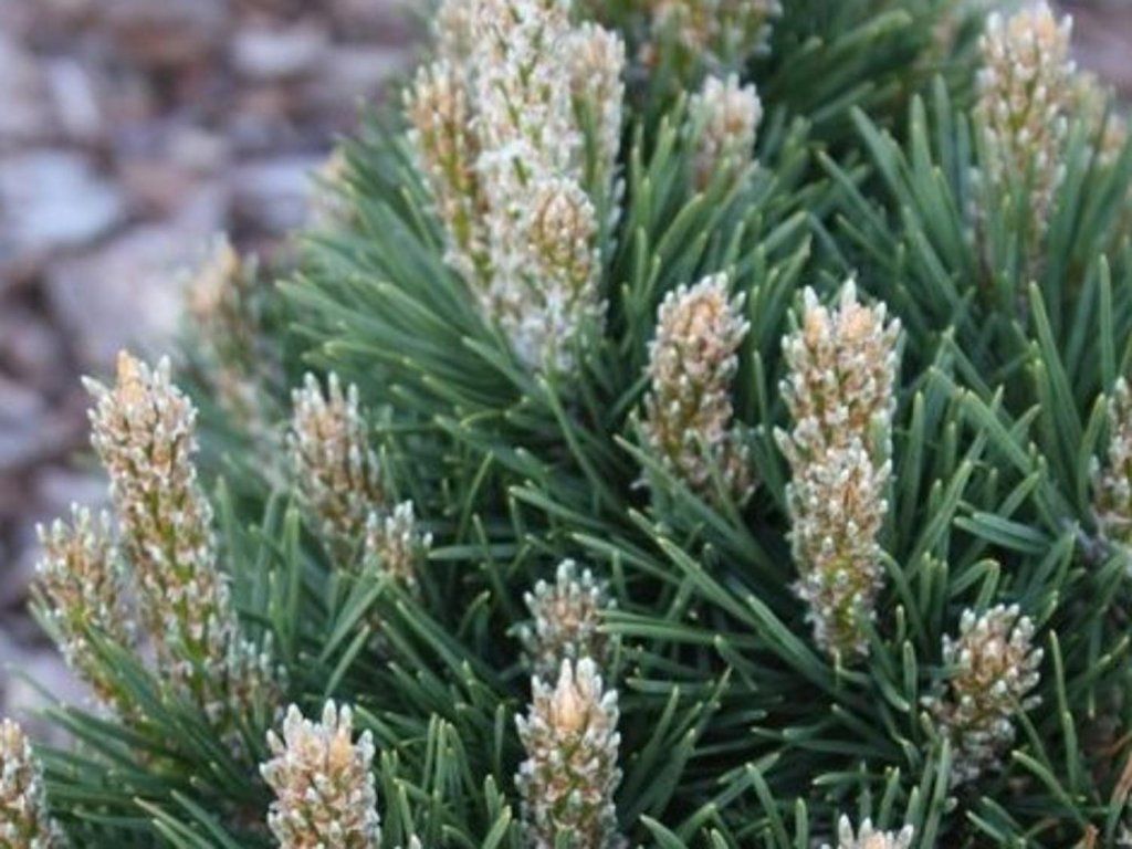 Bergkiefer 'Dom' - ein langsam wachsender Kultivar der Bergkiefer, oft auch als Pinus uncinata 'Dom' bezeichnet, also aus Bergkiefern, die an Wind, Frost und magere, steinige Böden angepasst sind. Im Gegensatz zu typisch kriechenden Kiefern bildet sie eine breit kegelförmige bis niedrig pyramidale, sehr kompakte Wuchsform mit kurzen Internodien und regelmäßiger Verzweigung. Mit etwa 10 Jahren erreicht sie eine Höhe von ca. 0,6 m und eine Breite von ca. 0,5 m, in den folgenden Jahren vergrößern sich die Maße langsam und die Krone bleibt dicht. Die Nadeln sind dicker, dunkelgrün, in Büscheln zu zweit, meist 3–5 cm lang und verbleiben mehrere Jahre an der Pflanze, so dass sie auch im Winter voll aussehen. Die Knospen sind harzig und im Frühjahr erscheinen kürzere „Kerzen“, die eine feine Formregulierung ohne Verlust des natürlichen Aussehens ermöglichen. Die Blüte ist unauffällig, die männlichen Zapfen sind im Frühjahr kurz gelb, später können sich kleine Zapfen bilden, die nach und nach reifen. Der Kultivar eignet sich als immergrüner Akzent für kleinere Gärten, Steingärten, Trockenmauern und moderne Schotterbeete, wo er die Komposition mit stabilem Grün verfeinert. Er lässt sich gut mit niedrigen Wacholdern, Heidekraut, Lavendel, Fetthennen und Ziergräsern kombinieren und bildet in Töpfen langfristig eine ansehnliche Form ohne aufwendiges Formen.