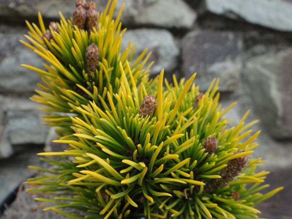 Bergkiefer 'Gold Coin Weis' - eine Zwergform der Bergkiefer, einer Gebirgsart aus alpinen und subalpinen Lagen Mittel- und Südosteuropas, wo sie an windigen Hängen und Geröllfeldern wächst. Sie bildet einen dichten, leicht abgeflachten, kugelförmigen Strauch mit kurzen Internodien und langsamem Wachstum. Mit 10 Jahren erreicht sie eine Höhe von ca. 0,4 m und eine Breite von ca. 0,5 m, im Erwachsenenalter hält sie sich je nach Standort meist bei einer Höhe von 0,5 m und einer Breite von 0,6–0,8 m. Die Nadeln wachsen zu zweit in Büscheln, sind 3–5 cm lang, in der Saison gelbgrün und färben sich in der kühlen Jahreszeit goldgelb, sodass die Pflanze auch im Winterbeet gut zur Geltung kommt. Die Knospen sind harzig und im Frühjahr trägt sie ausgeprägte „Kerzen“, die zur noch kompakteren Wuchsform leicht reguliert werden können. Die Blüte ist unauffällig, die männlichen Kätzchen sind kurz gelb, die Zapfen reifen allmählich und bleiben dekorativ braun. Die Sorte eignet sich als niedrige Solitärpflanze, für Steingärten, Heidegärten und Trockenbeete, und funktioniert auch gut in Kübeln auf der Terrasse oder am Eingang. In Kompositionen harmoniert sie mit Heidekraut, Preiselbeeren, trockenheitsliebenden Gräsern, Thymian und Frühlingszwiebelblumen, wo sie einen immergrünen Grund und eine ruhige Struktur bietet.