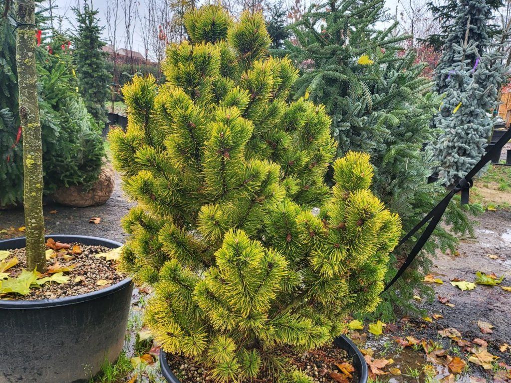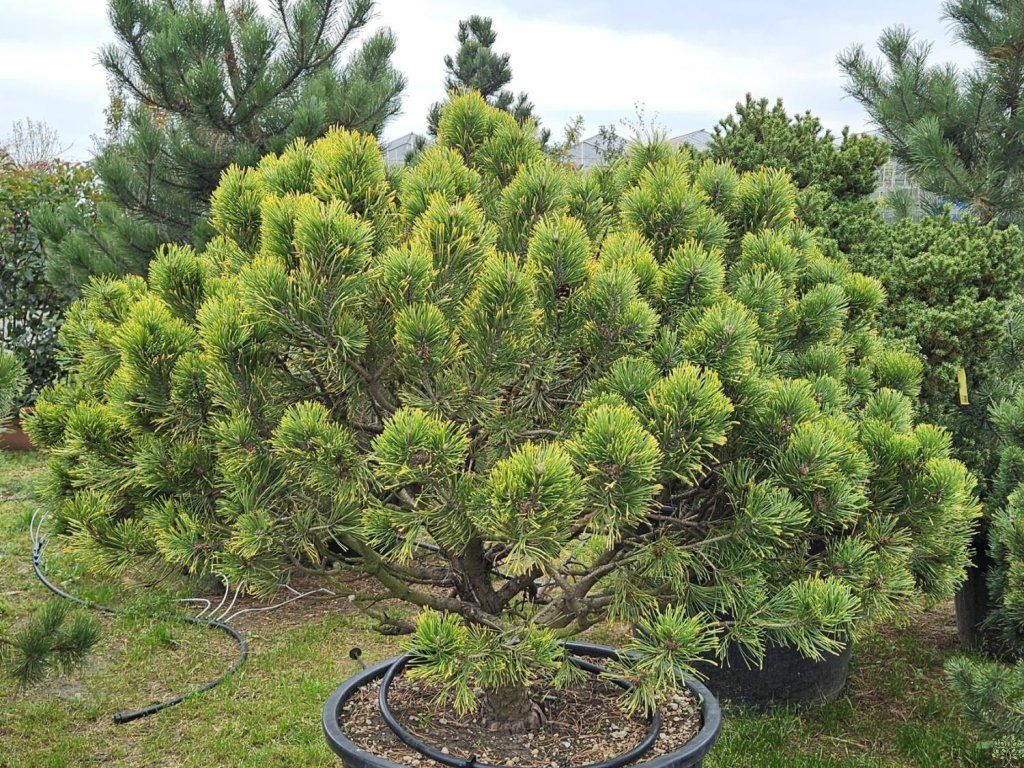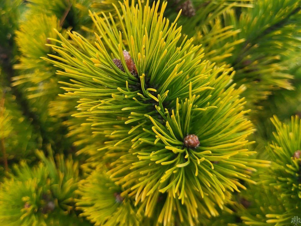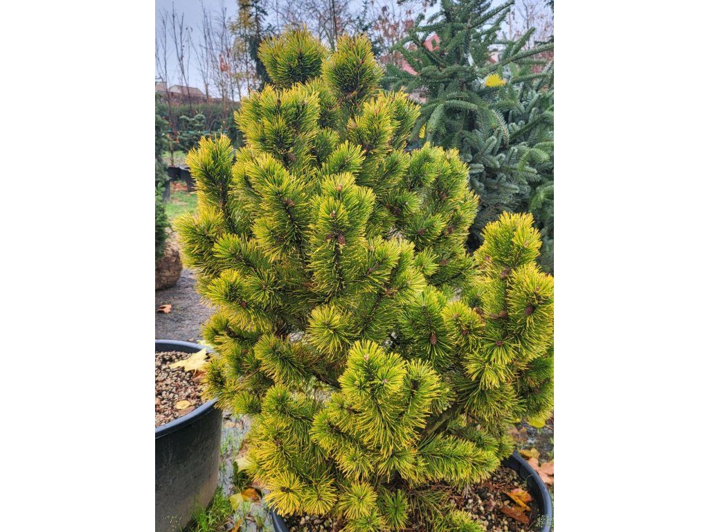 Bergkiefer 'Golden Glow' – Die Sorte 'Golden Glow' gehört zu den Zwergformen, die im Winter gelb sind. Sie wurde in den ersten zehn Jahren des 21. Jahrhunderts in Großbritannien auf den Markt gebracht und hat sich allmählich in europäischen Baumschulen und Gärten verbreitet. Unter unseren Bedingungen erreicht sie in 10 Jahren eine Höhe von ca. 0,8–1 m und eine Breite von 0,8–1 m, im Erwachsenenalter normalerweise etwa 0,8–1,3 m Höhe und 1–1,5 m Breite, je nach Standort und Boden. Sie bildet dichte, anfangs fast kugelförmige, später leicht kuppelförmige Sträucher mit verkürzten, teilweise hervorstehenden Ästen. Die Zweige tragen Büschel von zwei Nadeln, die ca. 4–6 cm lang sind und im Frühling und Sommer grün bis gelbgrün sind. Ab Mitte Herbst nehmen die Nadeln allmählich leuchtend goldene Farbtöne an und bleiben so bis zum frühen Frühling. Aus der Nähe ist eine feine Abstufung von helleren und satteren Tönen um die Endknospen zu erkennen, was der Krone den Eindruck eines zart beleuchteten, warmen „Scheins“ inmitten des Wintergartens verleiht. Zapfen erscheinen an niedrigen Sträuchern nur vereinzelt und haben in der Gartengestaltung eher eine dekorativ Bedeutung. Dank ihres kompakten Wuchses und ihrer ausgeprägten Winterfarbe wird die 'Golden Glow' als kleine Solitärpflanze in Steingärten, Heide- und Schotterbeeten, Vorgärten sowie in Kübeln auf Terrassen verwendet, wo sie dunkelgrüne Nadelgehölze, Gräser und trockenheitsliebende Stauden gut begleitet.