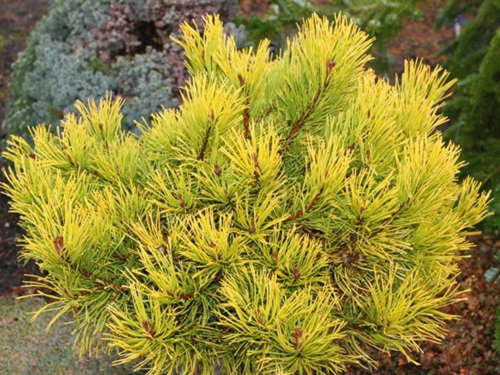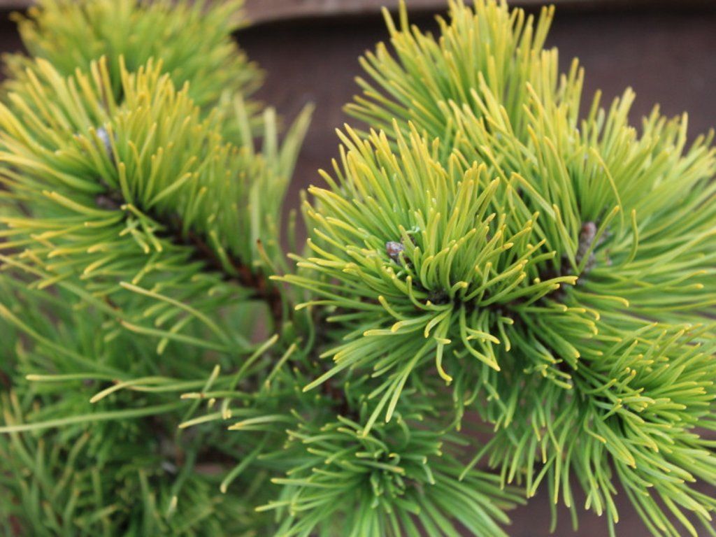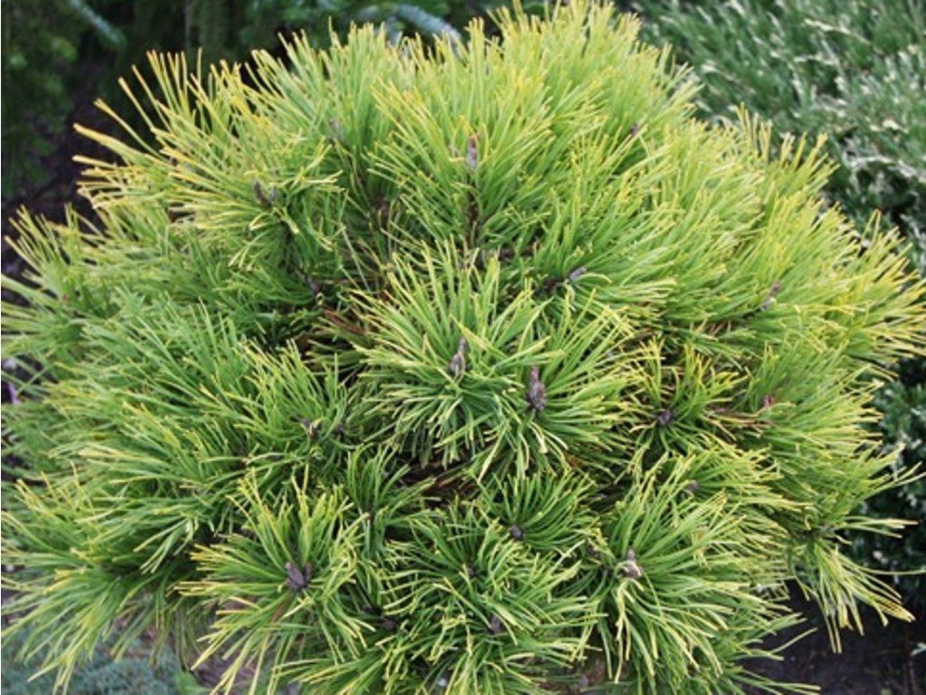 Kiefer 'Jalubí' – ein Berg-Nadelstrauch aus Mittel- und Südeuropa, der natürlicherweise an windigen, felsigen Hängen und in der subalpinen Zone wächst. Die Sorte 'Jalubí' ist eine tschechische Selektion, die 1987 in den Handel kam. Sie zeichnet sich durch einen dichten, kompakten Wuchs und eine saisonale Veränderung der Nadelfarbe aus. Während der Vegetationsperiode sind die Nadeln frischgrün, zu zweit in Büscheln, etwa 3–5 cm lang. Nach den Herbstfrösten verfärben sie sich goldgelb und im Frühling kehren sie wieder zum Grün zurück. Das Wachstum ist langsam, die jährlichen Zuwächse liegen oft bei etwa 5–10 cm. Mit 10 Jahren erreicht sie normalerweise etwa 0,6 x 0,6 m, im ausgewachsenen Zustand kann sie jedoch allmählich etwa 1–2 m hoch werden und sich je nach Standort und Schnitt auf 2–2,5 m ausbreiten. Die Zapfen sind klein, eiförmig bis länglich, erscheinen unregelmäßig und können mehrere Saisons an der Pflanze verbleiben. In der Komposition wird 'Jalubí' als immergrüner Akzent zwischen Heidekraut, Zwergwacholder, niedrigen Ziergräsern und Stein eingesetzt, wo die winterlichen gelben Nadeln die Struktur des Beetes auch ohne Blüten hervorheben. Dank ihres niedrigen Wuchses eignet sie sich auch für Vorgärten und Kübel, wo sie die umliegende Bepflanzung nicht überragt.