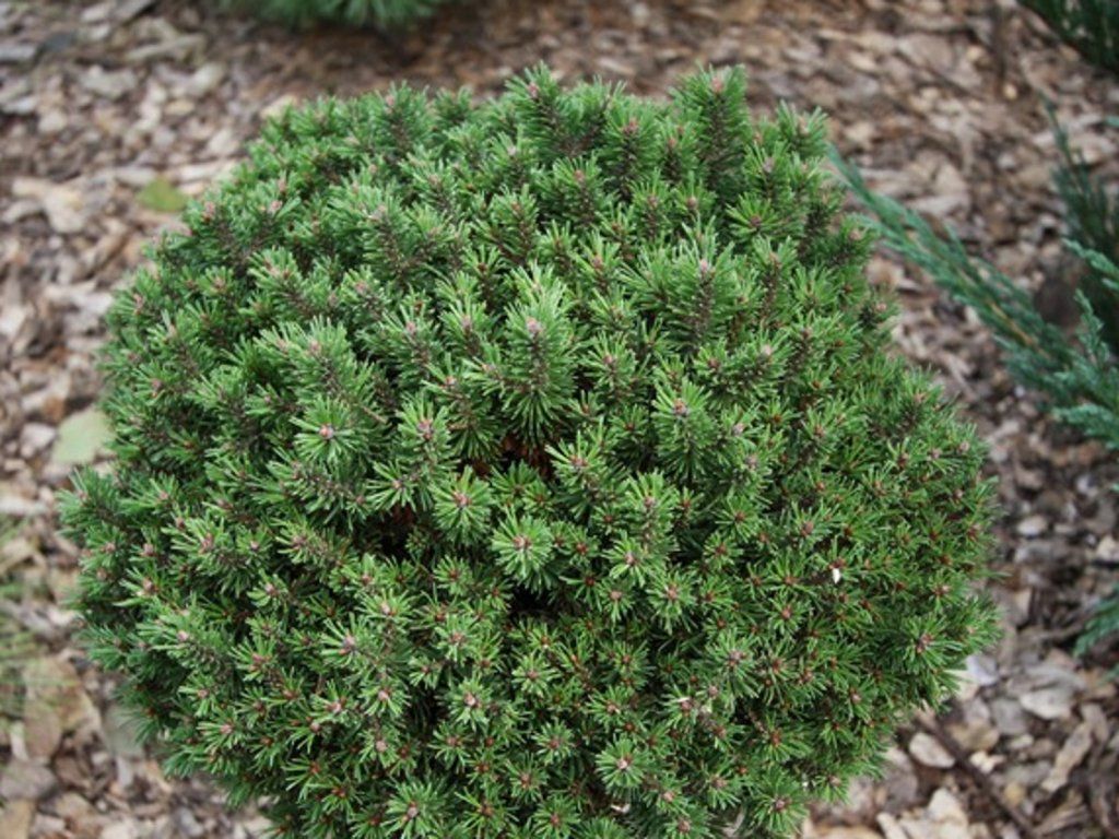 Bergkiefer 'Kostelnicek' - ein interessanter Kiefernkultivar, der einen kleinen, kugelförmigen Strauch bildet. Im Erwachsenenalter erreicht der Kultivar eine Höhe von etwa 40 - 50 cm. Das jährliche Wachstum beträgt nur 2 - 3 cm, es ist also sehr langsam. Die Nadeln wachsen in dichten Gruppen über die gesamte Länge der Zweige. Sie sind kurz, fest und dunkelgrün gefärbt. An den Spitzen sind die Nadeln leicht zugespitzt. Ideal für die Pflanzung in Beete, Steingärten, Behälter oder als Solitär in Gärten oder Parks. Die Sorte ist pflegeleicht und voll frostbeständig.