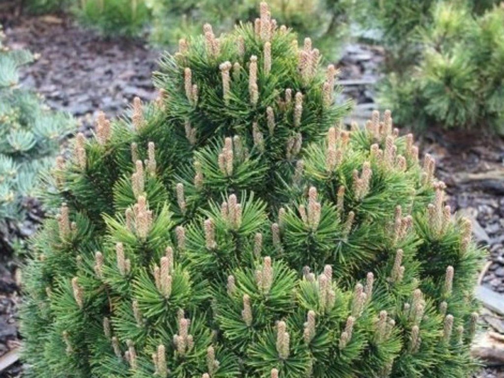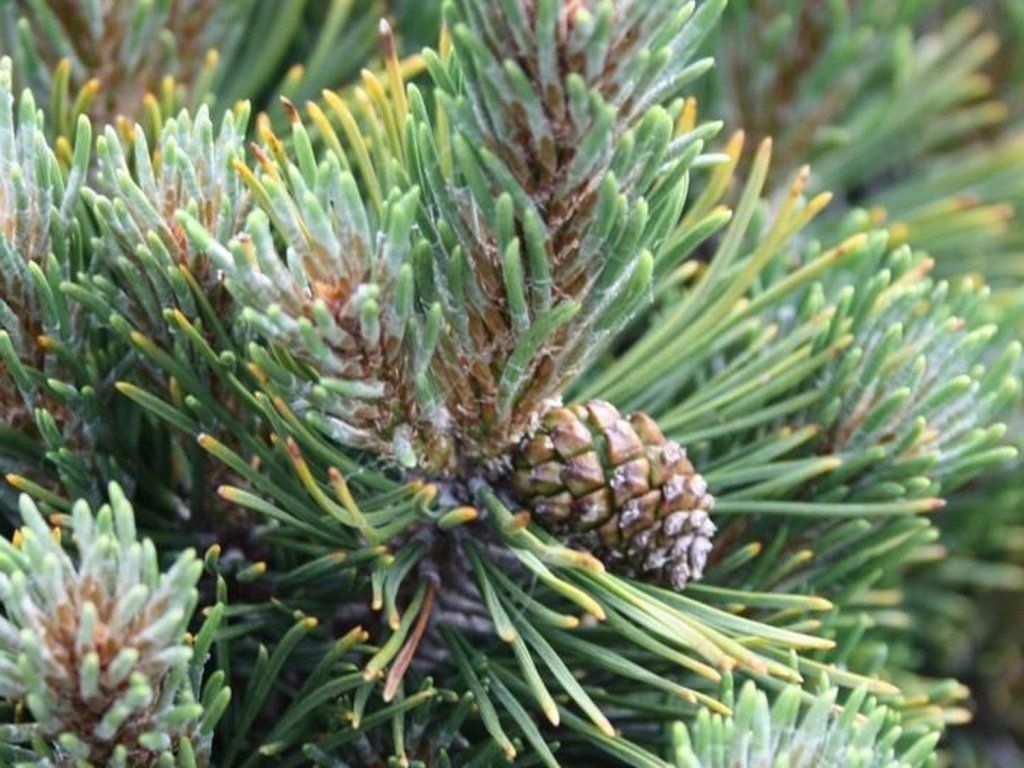 Bergkiefer 'Leucolike' - eine Zwergform der Bergkiefer aus der europäischen Gruppe der Bergkiefern, die natürlich an windigen Hängen und felsigen Böden oberhalb der Baumgrenze gebunden ist. Im Garten wird sie als immergrüner Strauch mit stabiler Struktur eingesetzt, ohne auffällige Blüte, dafür mit ausgeprägter Verzweigungszeichnung. Die Sorte 'Leucolike' bildet eine dichte, mehrstämmige Krone und eine ansehnliche, breit kegelförmige Gestalt. Die Nadeln sind dunkelgrün, in Büscheln zu zweit, an kurzen Zweigen wirken sie kompakt. Das Wachstum ist langsam, etwa im Alter von 10 Jahren erreicht sie eine Höhe von ca. 1 m und eine Breite von ca. 0,6 m, später breitet sie sich langsam aus. Die Zapfen erscheinen unregelmäßig, reifen zu Brauntönen heran. Dank der Dichte der Äste eignet sie sich auch für kleine Gärten, Steingärten, Heidegärten und für Kübel, wo sie eine ganzjährige Kulisse für blühende Stauden und Ziergräser bildet. In Kompositionen funktioniert sie gut mit Erikas, Thymian, Lavendel oder trockenheitsliebenden Fetthennen.