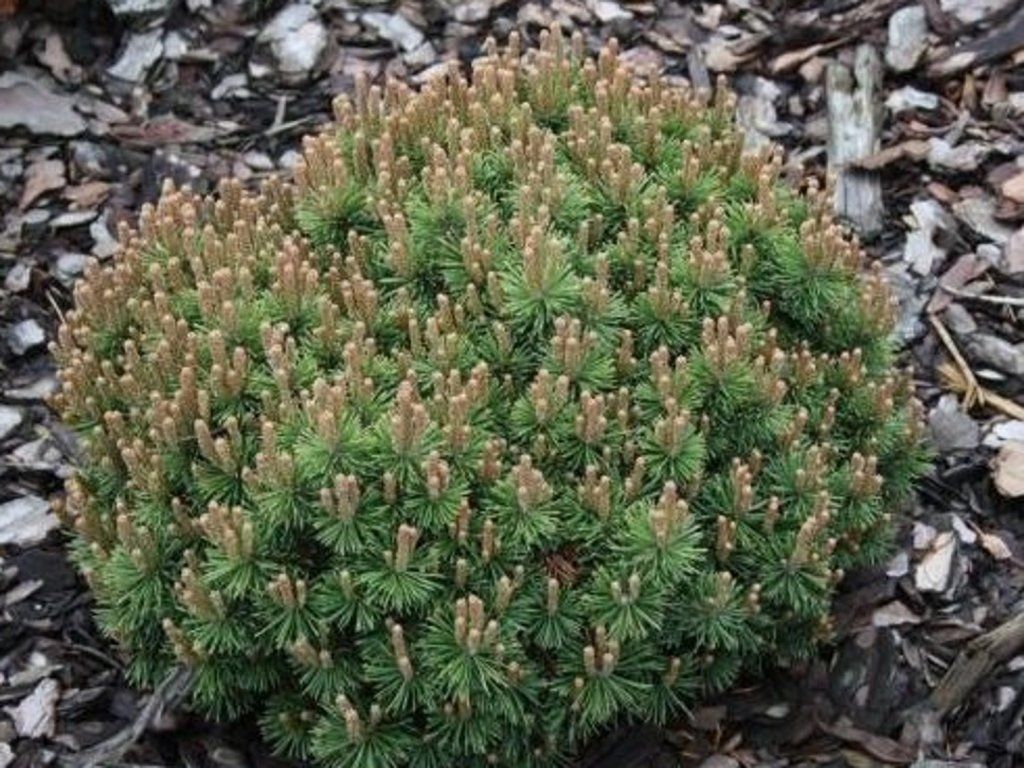 Bergkiefer 'Mini Mini' - leitet sich von der Bergkiefer ab, die ursprünglich aus den Bergregionen Mittel- und Südeuropas stammt, wo sie an felsigen Hängen wächst, die Wind, Schnee und starker Sonne ausgesetzt sind. Die Sorte gehört zu den niedrigsten Formen der Bergkiefer und bildet einen sehr langsam wachsenden, kompakten Strauch mit einer kissenförmigen bis niedrig-kugelförmigen Krone. Unter unseren Bedingungen erreicht sie in 10 Jahren eine Höhe von etwa 0,15–0,25 m und eine Breite von 0,3–0,4 m, nach vielen Jahren normalerweise etwa 0,3–0,4 m Höhe und 0,4–0,6 m Breite. Die jährlichen Zuwächse liegen zwischen 1 und 2 cm, sodass der Strauch langfristig sehr platzsparend ist und normalerweise keinen Formschnitt benötigt. Die Triebe sind kurz und dicht verzweigt, was der Krone ein festes, zusammenhängendes Aussehen verleiht. Die Nadeln wachsen zu zweit in Büscheln, sind kurz, etwa 2–4 cm lang, mittel- bis dunkelgrün und oft leicht verdreht. Sie verbleiben mehrere Jahre an den Trieben, sodass die Pflanze auch im Winter nicht lichtdurchlässig wirkt. Die Zapfen erscheinen bei solch Zwergformen nur sporadisch, sind klein, eiförmig-kegelförmig und haben in Kompositionen hauptsächlich dekorative Bedeutung. Dank der Kombination aus sehr geringem Wuchs und dichtem Nadelwerk wird der Kultivar als kleine Solitärpflanze in Steingärten, Schotter- und Dachgärten, in Trögen, Schalen und kleinen Vorgärten eingesetzt.