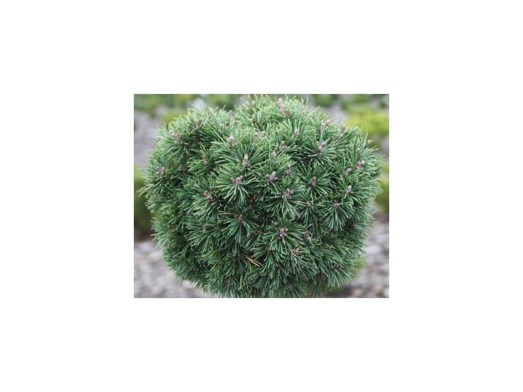 Zwergkiefer 'Mini Mops' - kompakter Kultivar, kugelförmig, langsam wachsend. Die Nadeln sind kurz, dunkelgrün. Erreicht eine Höhe von 30 cm und eine Breite von 40 cm. Er ist auch ideal für die Kultivierung in Containern und anderen Gefäßen.